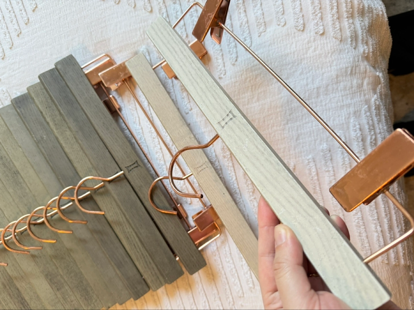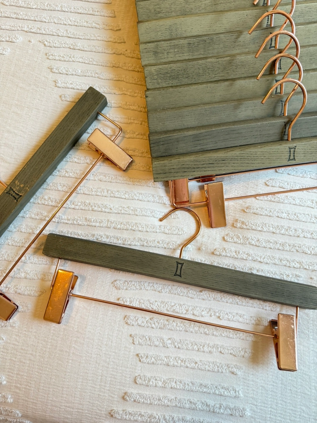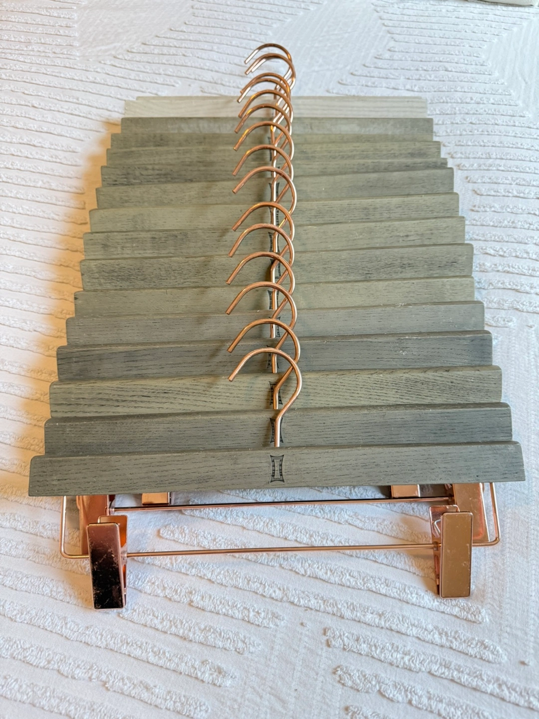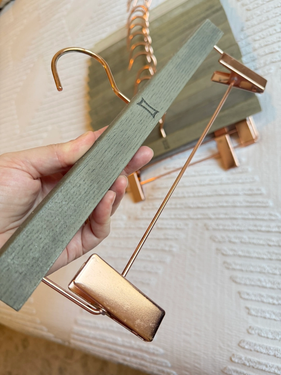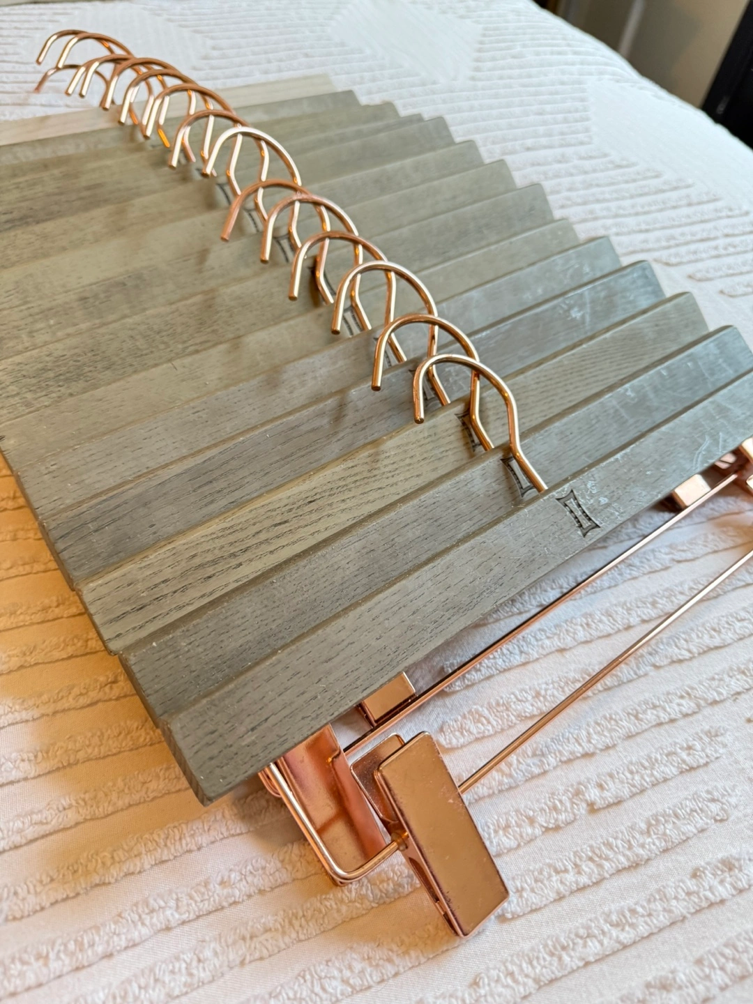 Elegant wood hangers with rose gold hanger hooks; from the brand Kit & Ace. Very sturdy and secure. 16 hangars in total; $5 per hangar or $64 for the lot.