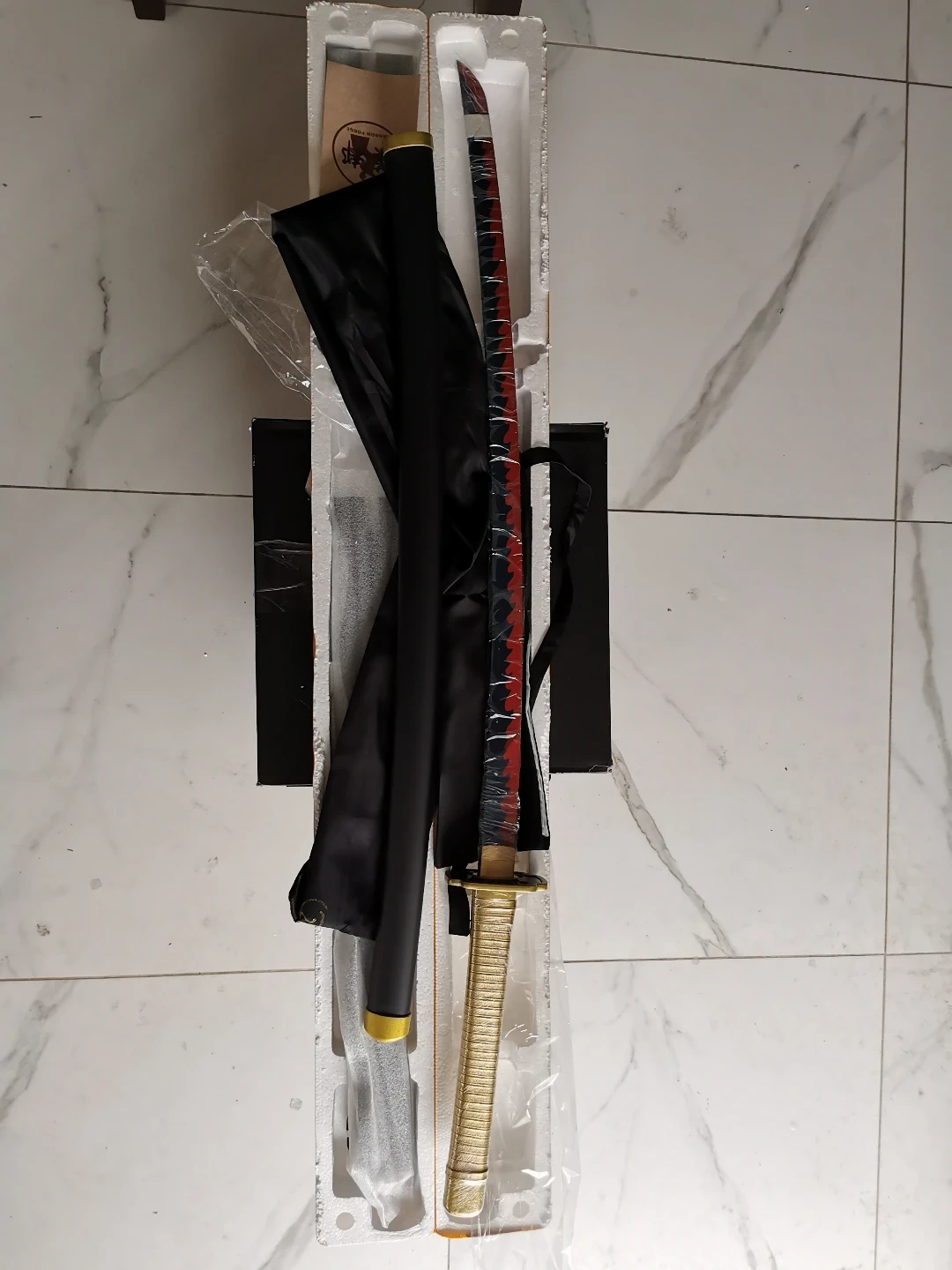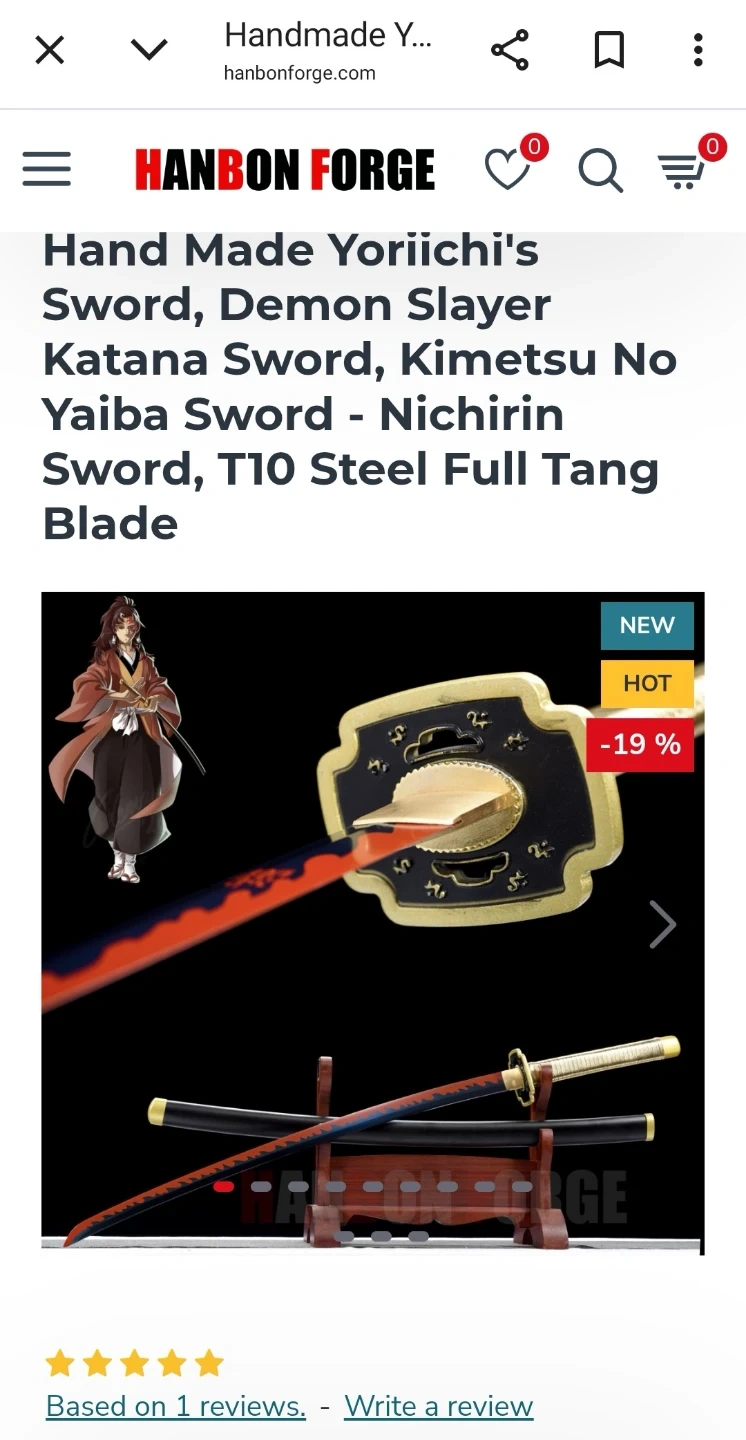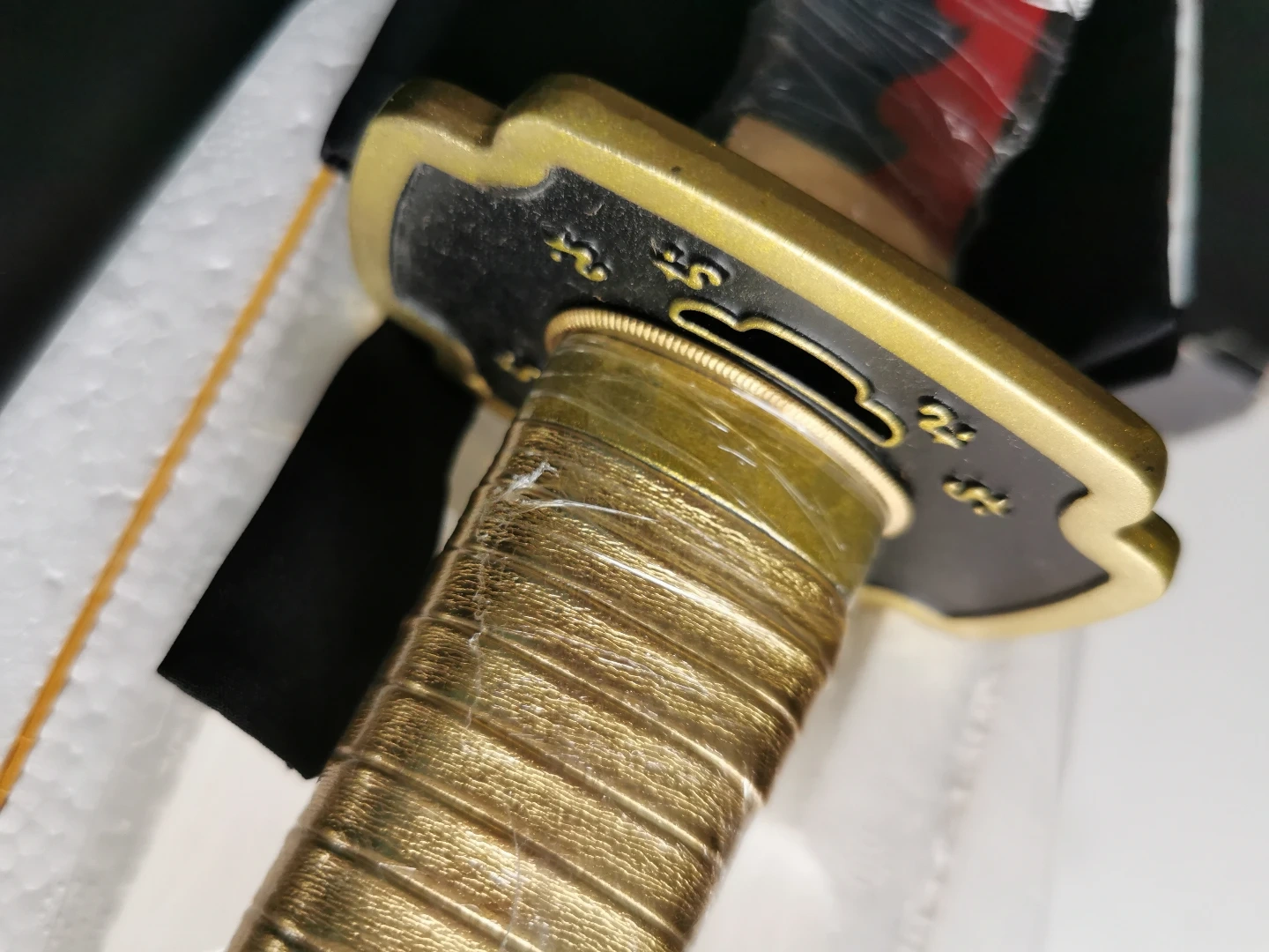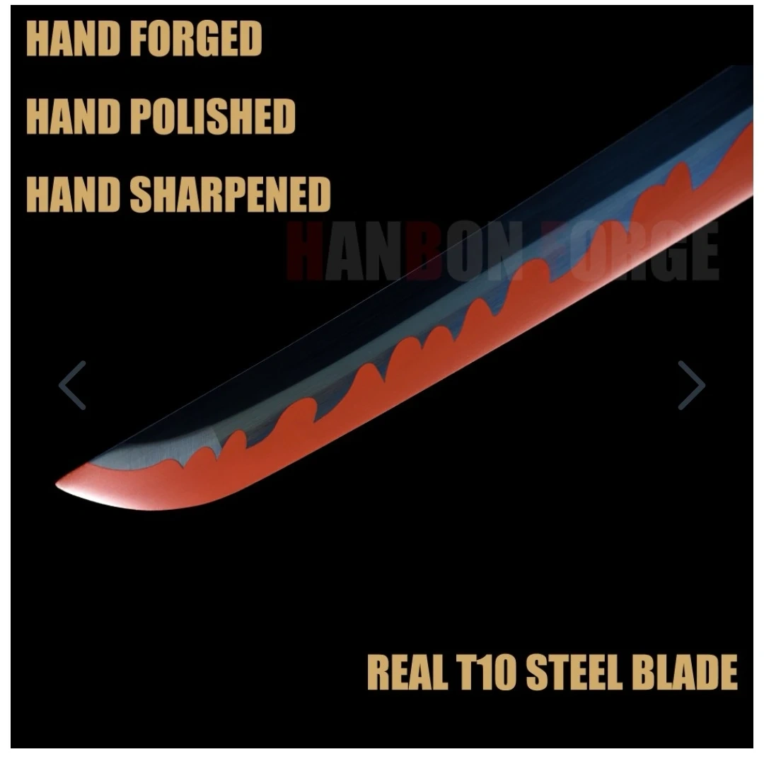 Handon Forge Hand-forged katana, full tang blade, T10 steel. Features a red and black blade design. Includes scabbard. Excellent condition.