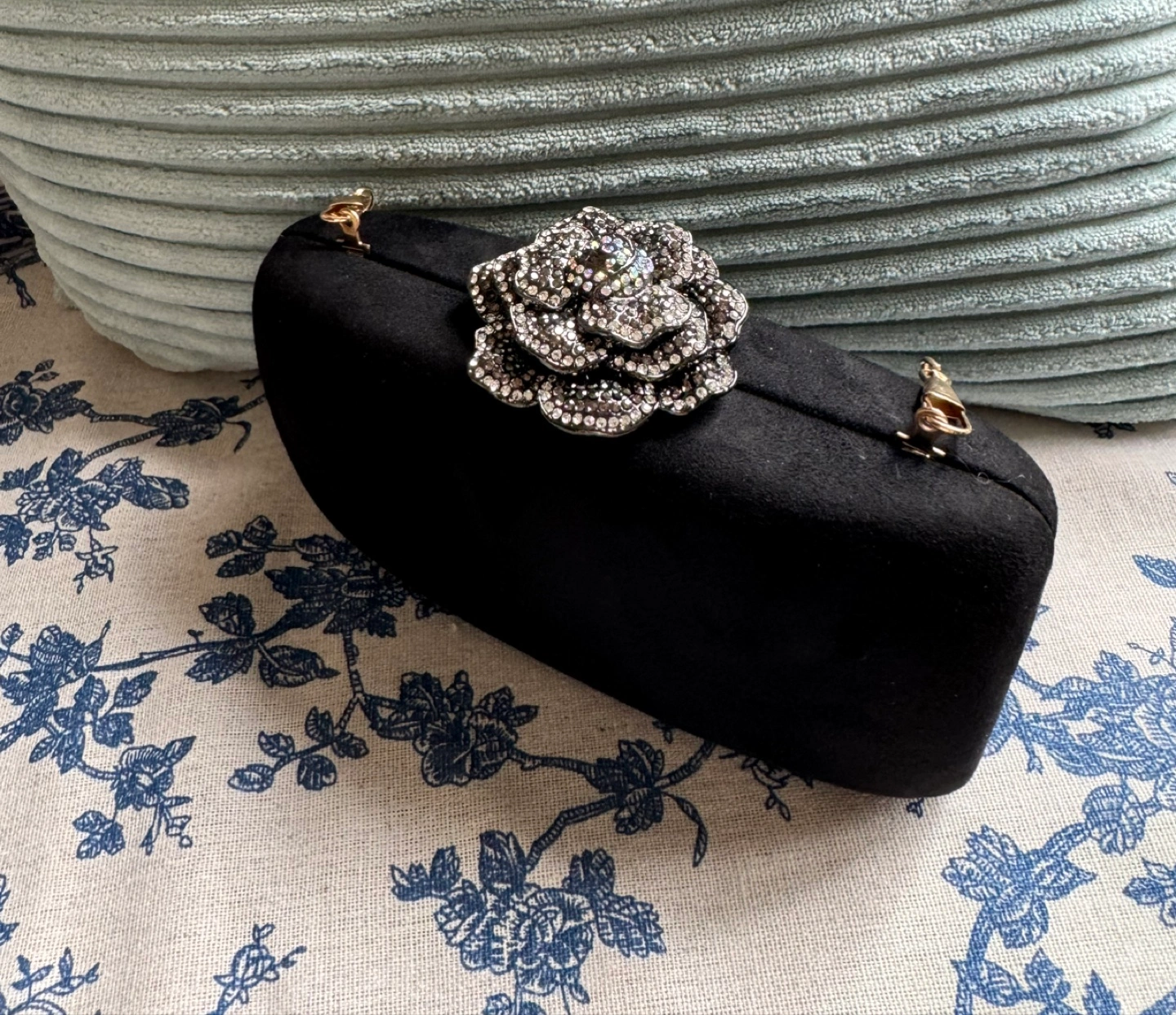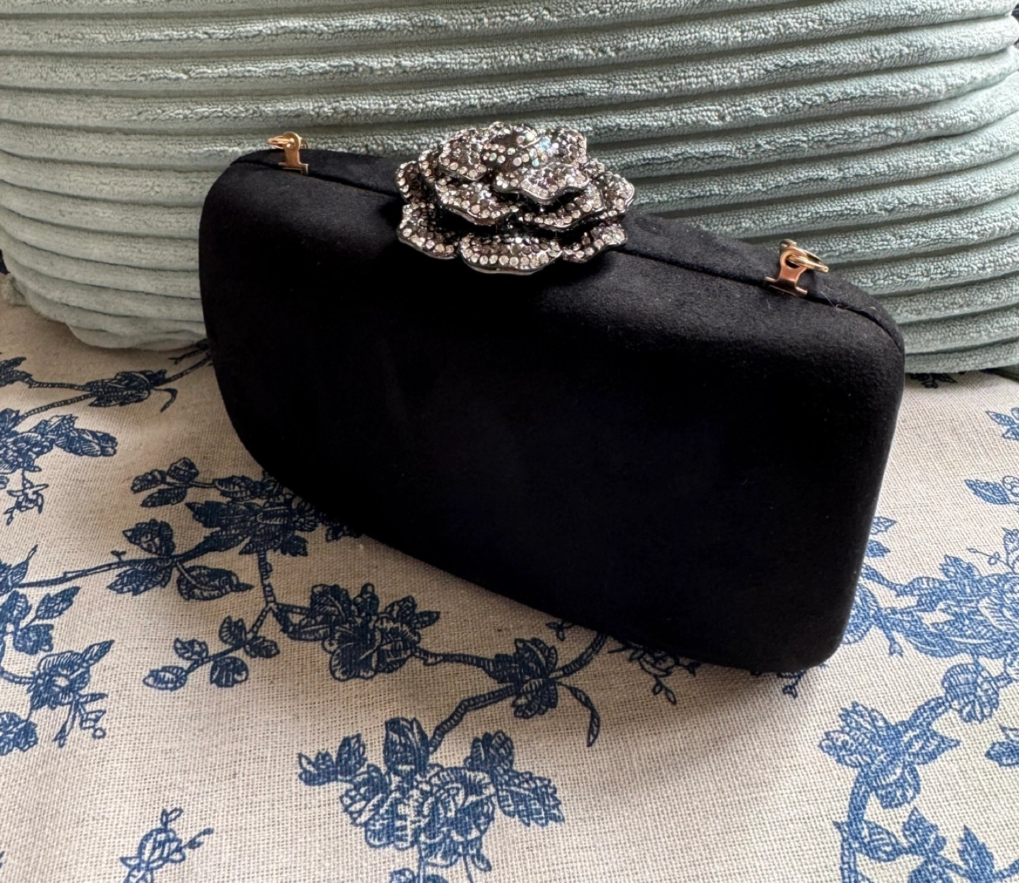 Beautiful beaded clutches, perfect for evening events. Options include black and ivory with floral and leaf detailing, and a black suede clutch with a sparkling rose embellishment.