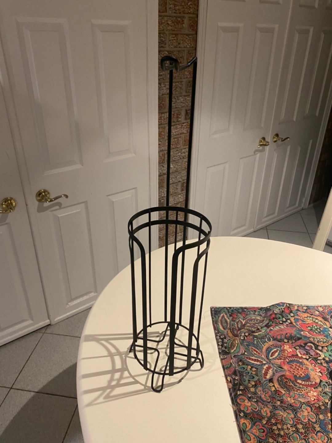 Free standing toilet paper holder. Metal construction. Black finish. Simple design.