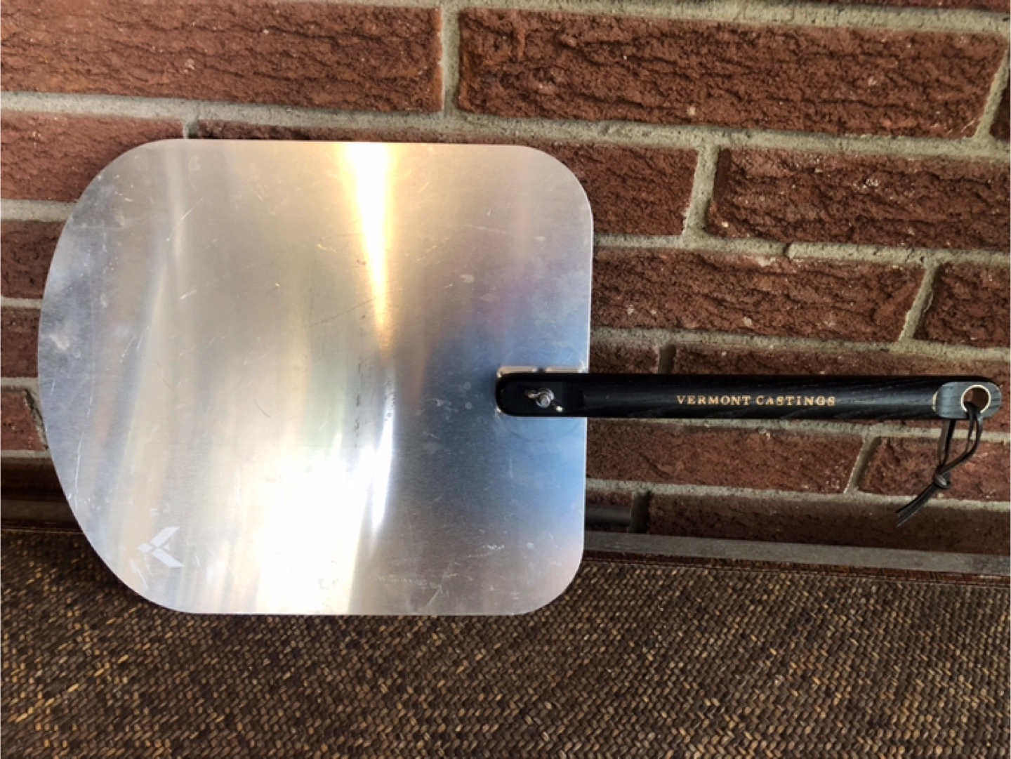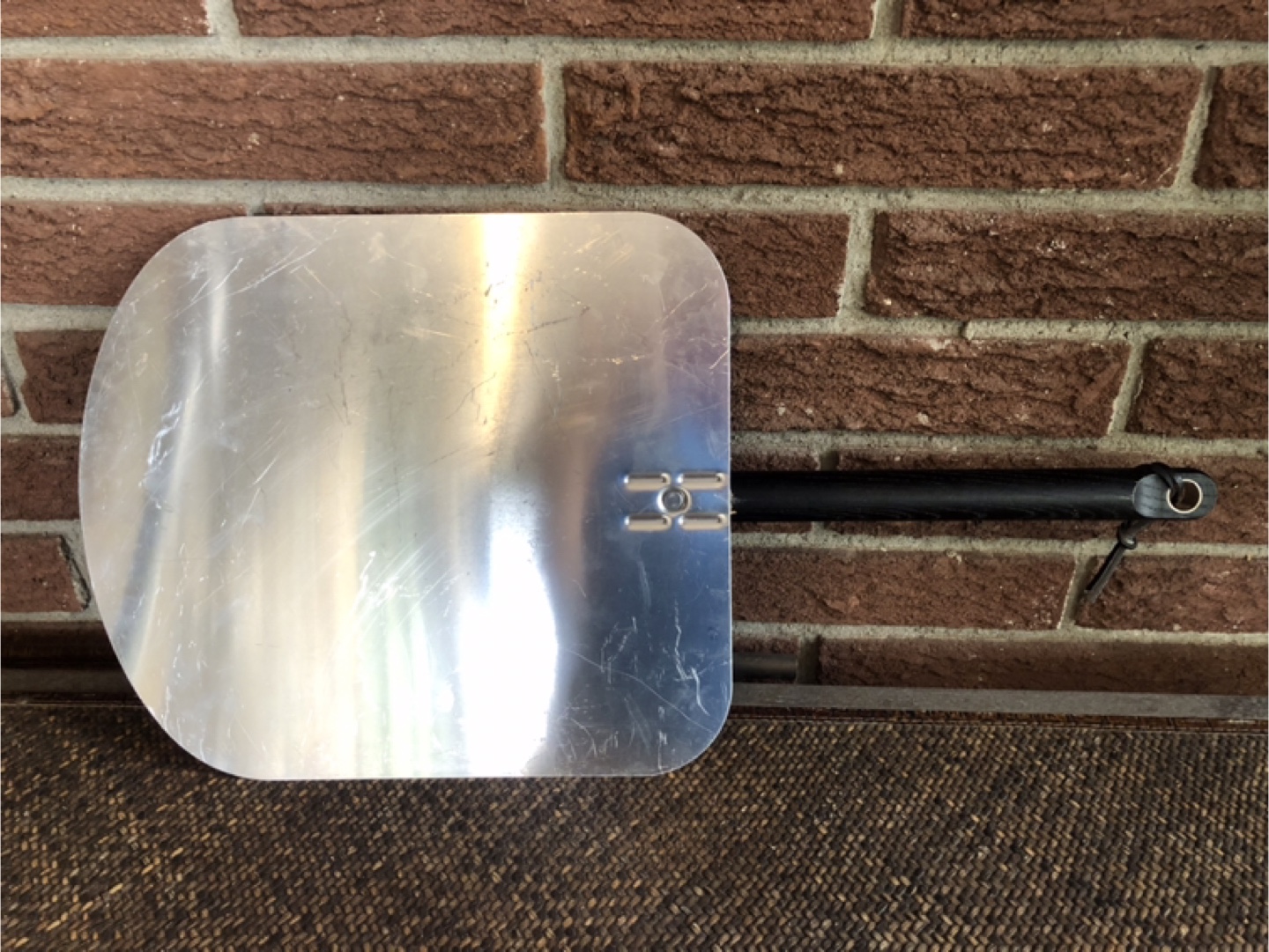 Large pizza spatula/peel…metal with folding hardwood wood handle. Useful for oven, pizza oven, or BBQ. Handy hanging loop.