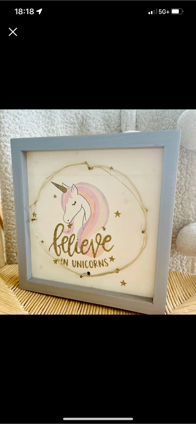 Cute framed decor featuring a unicorn and the phrase "Believe in Unicorns." Features integrated fairy lights. Does not include batteries Approximately 21cm x 21cm.