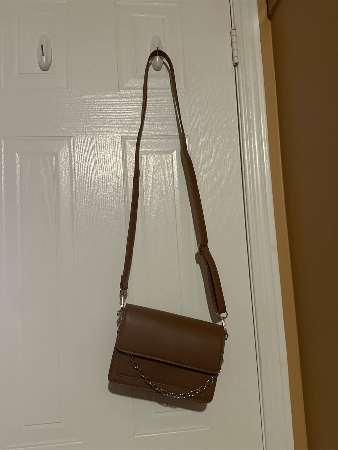 Brown faux leather crossbody bag. Features a silver chain detail and adjustable strap. Perfect everyday bag.