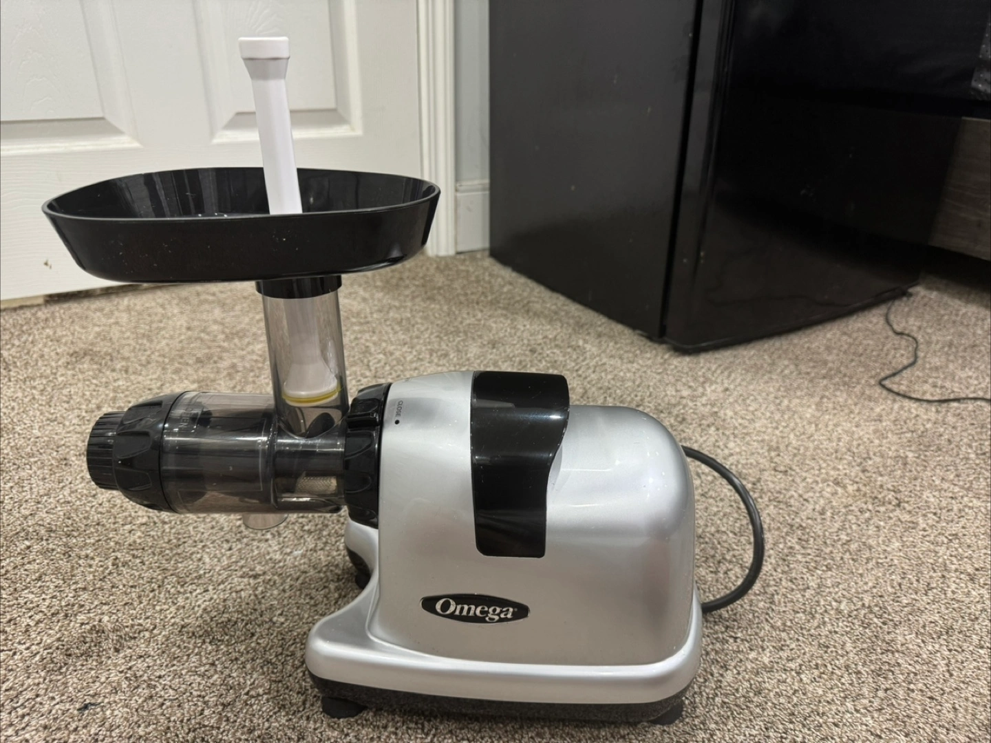 Omega juicer and food processor. Includes multiple containers and cleaning brush. Silver and black. Excellent condition.