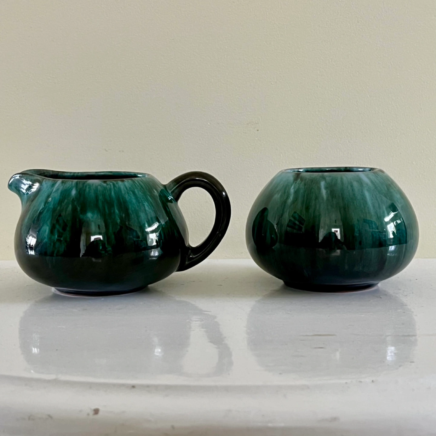 This is a beautiful, used Blue Mountain Pottery cream and sugar set, perfect for adding a touch of Canadian mid-century charm to your table. The set features the classic BMP green glaze. They are in good condition, showing some signs of gentle use which only adds to their vintage appeal.