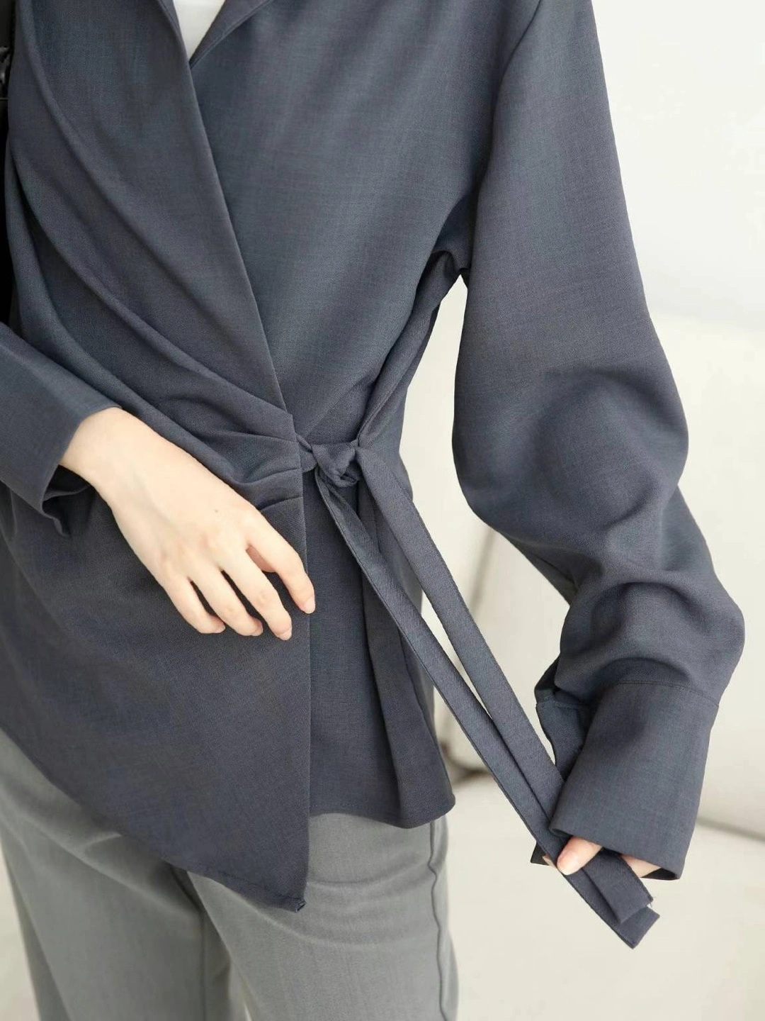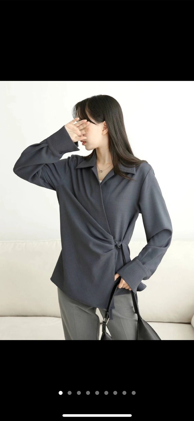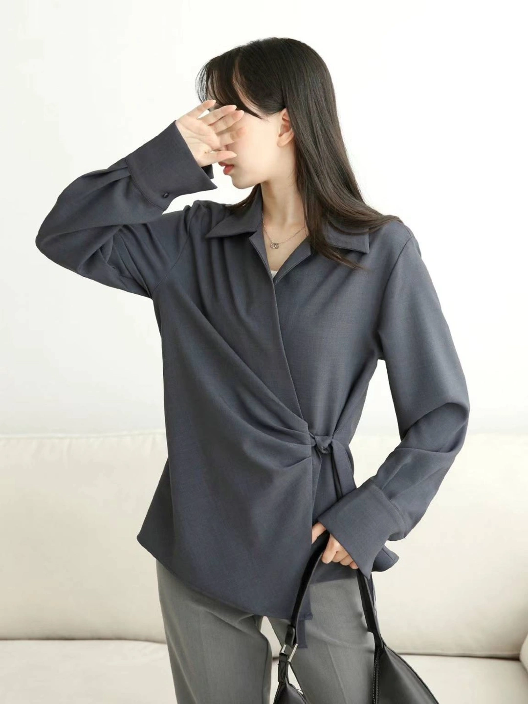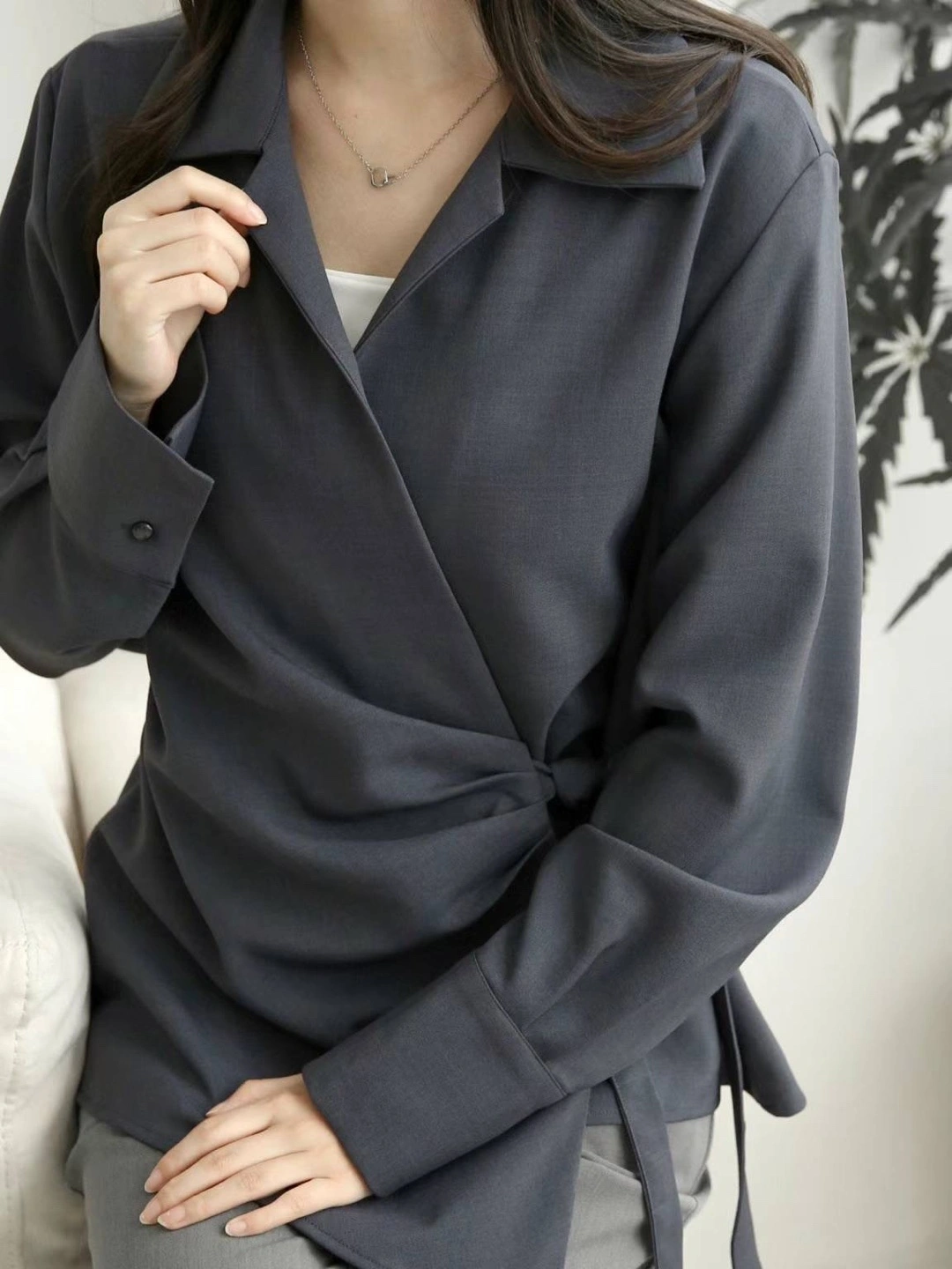 Long-sleeved wrap blouse. Dark grey colour. Features a collared neckline and self-tie waist detail. Relaxed fit.
