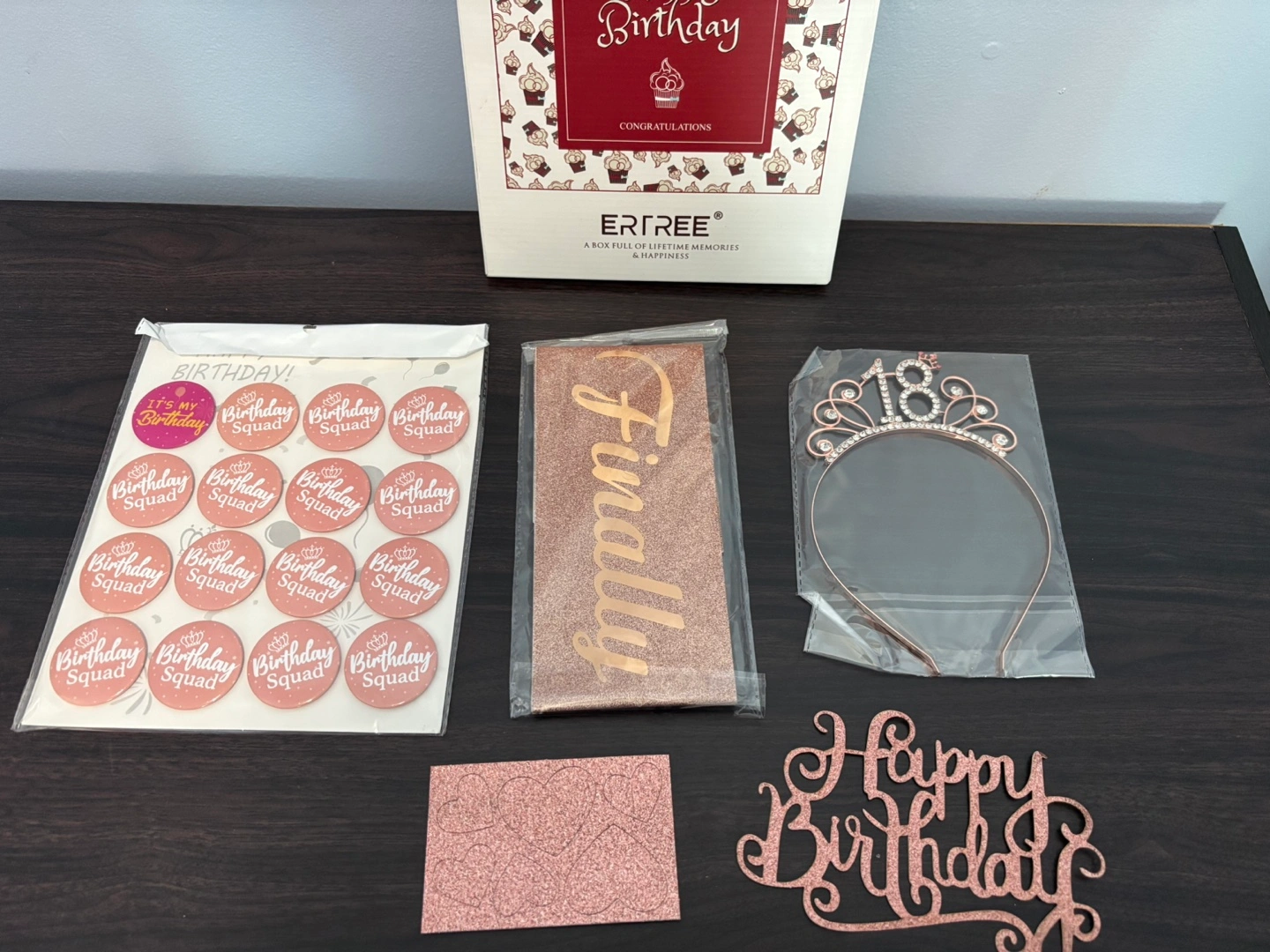 Includes a tiara, sash, cake topper, and twelve birthday squad buttons. Perfect for an 18th birthday celebration. Rose gold theme.
