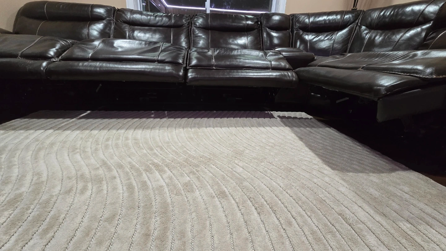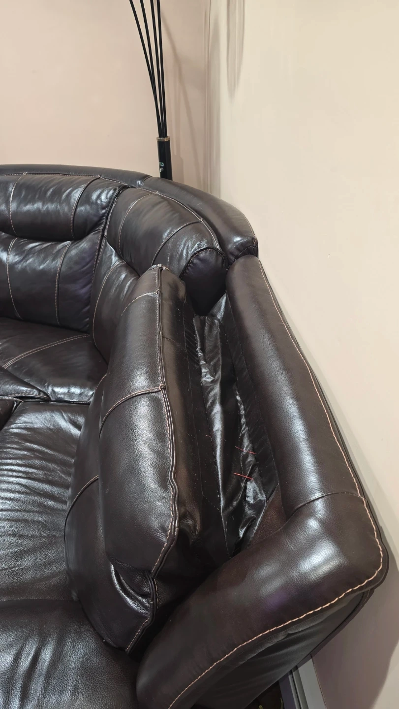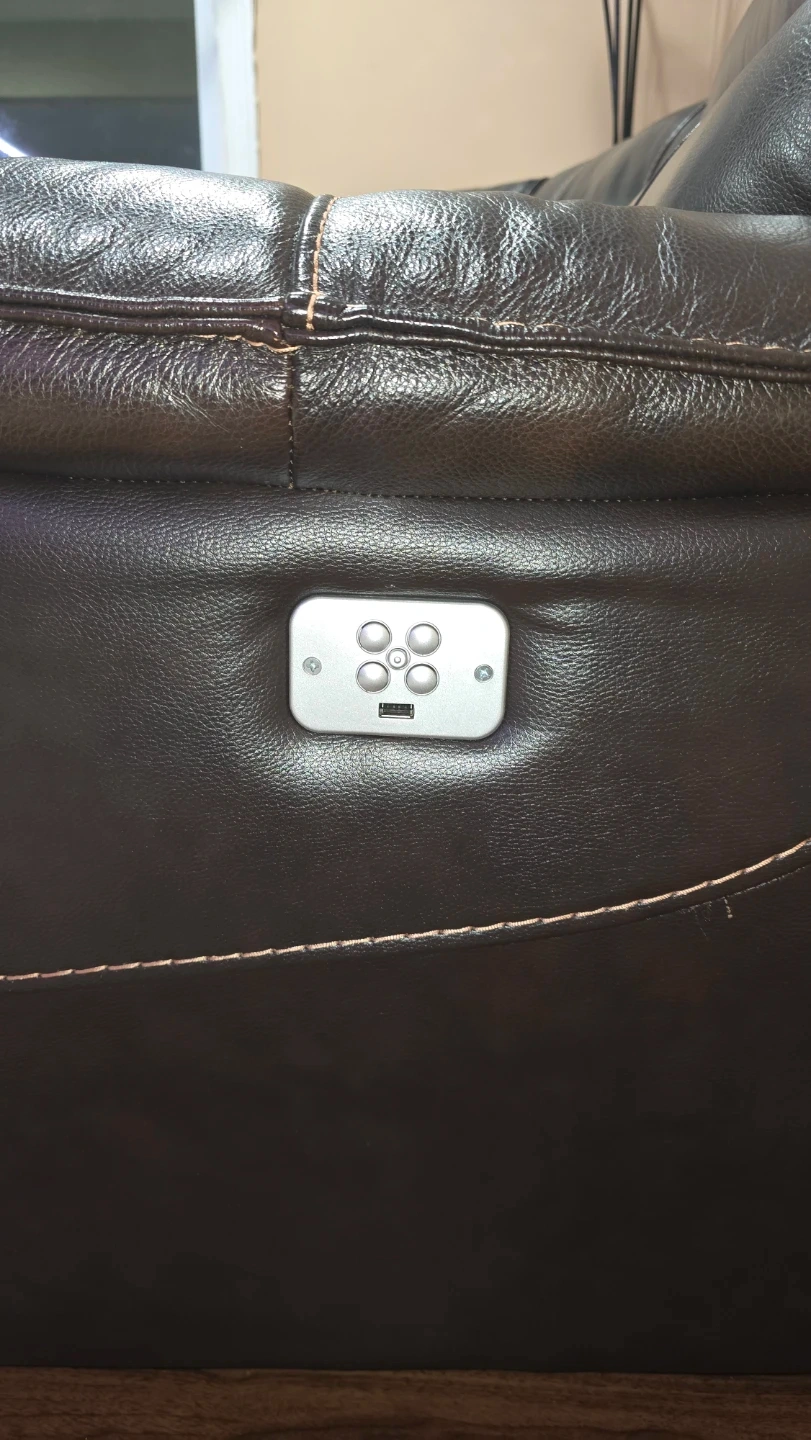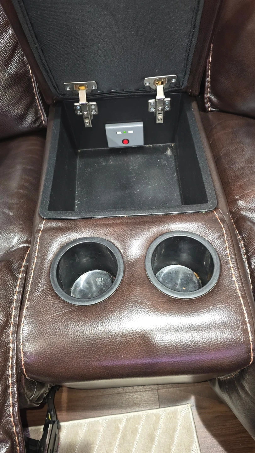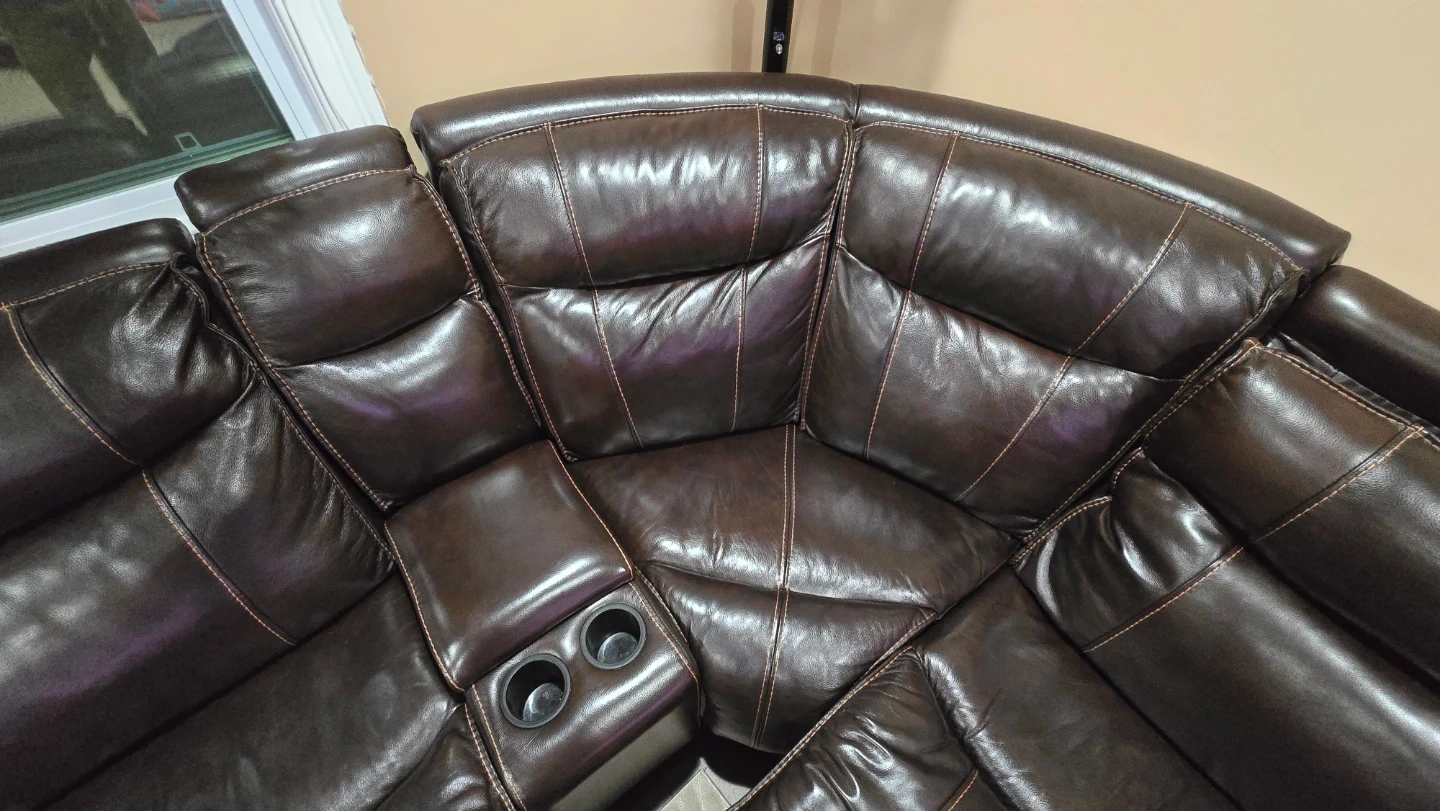 Selling a comfortable brown leather sectional sofa. It features reclining seats for ultimate relaxation. The sofa also includes a convenient center console with cupholders and 4 USB charging. It's in good condition and ready for a new home!