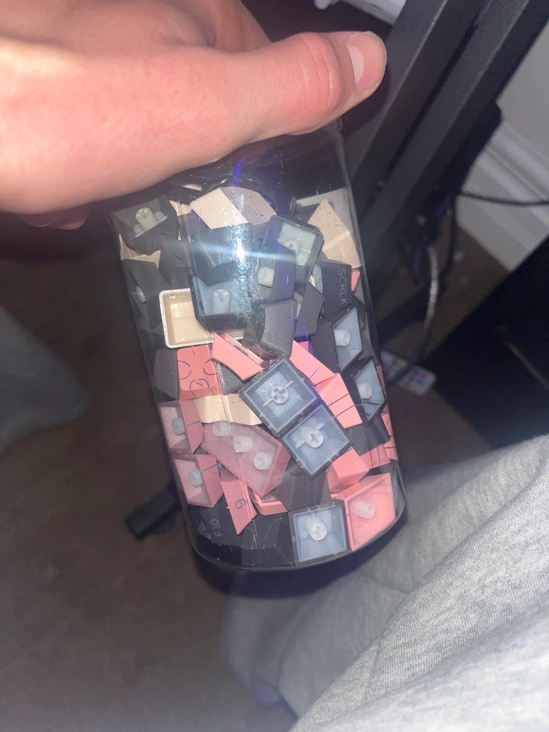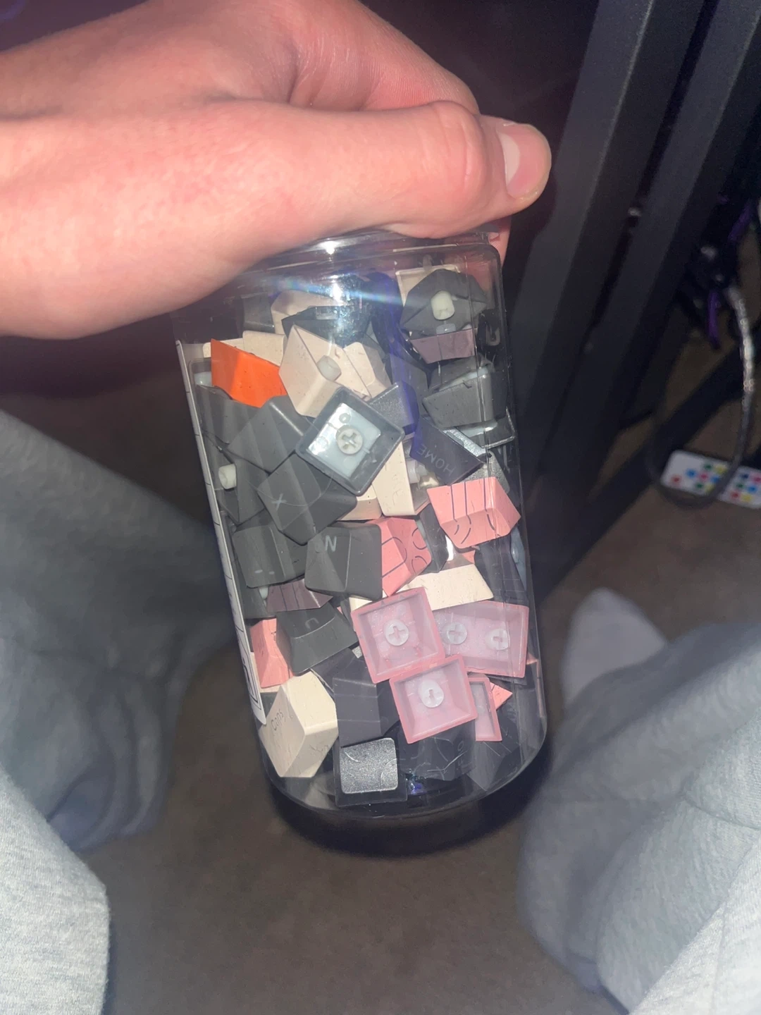 A collection of assorted keycaps for mechanical keyboards. Includes various colours like pink, grey, and black and orange, with some featuring legends. These are spares or extras for customizing your keyboard. Good for building a unique keyboard setup!