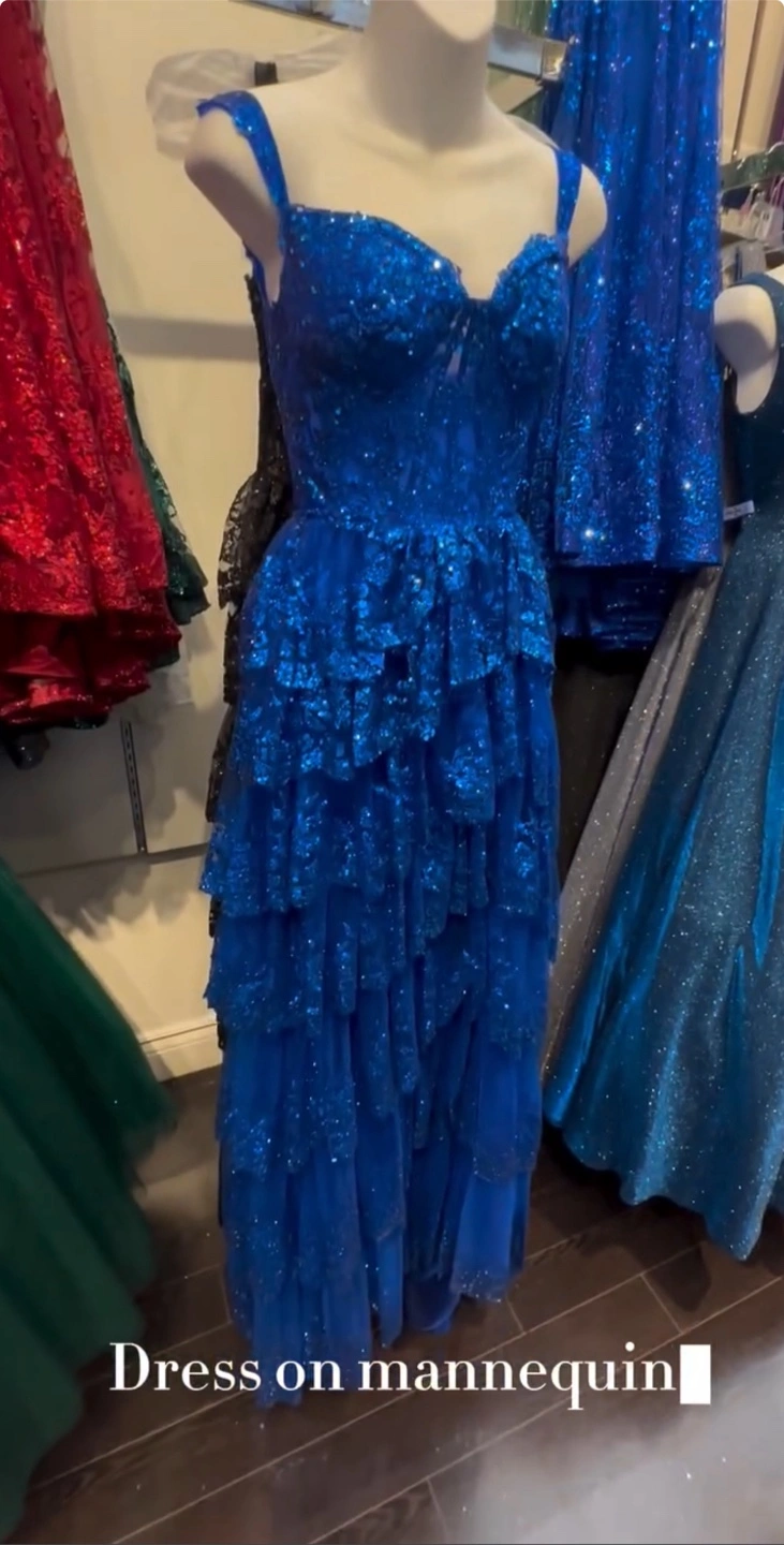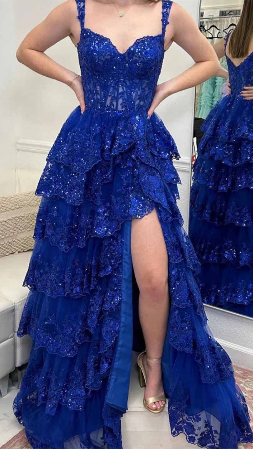 2025 New Release Royal blue prom dress. Layered ruffles, sequence bodice and a slit. Perfect for prom or a special occasion. Worn only once for a short amount of time. No rips or stains. Size 8