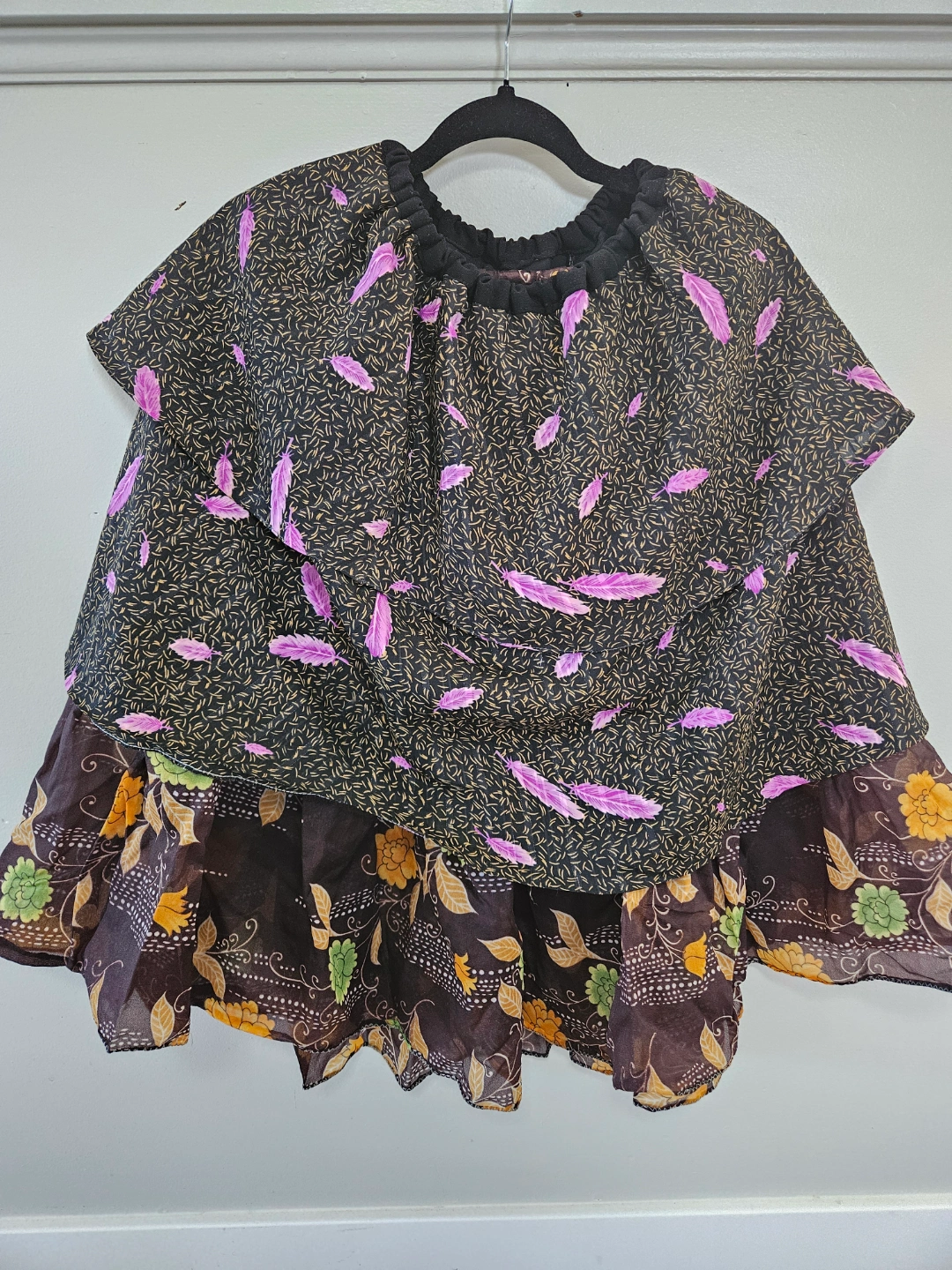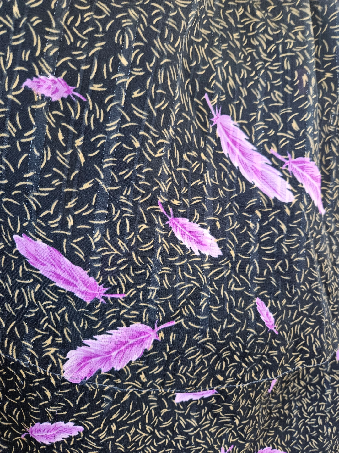 1st one: Knee length skirt with purple feather prints on a black background. Fits XS-S. $2
