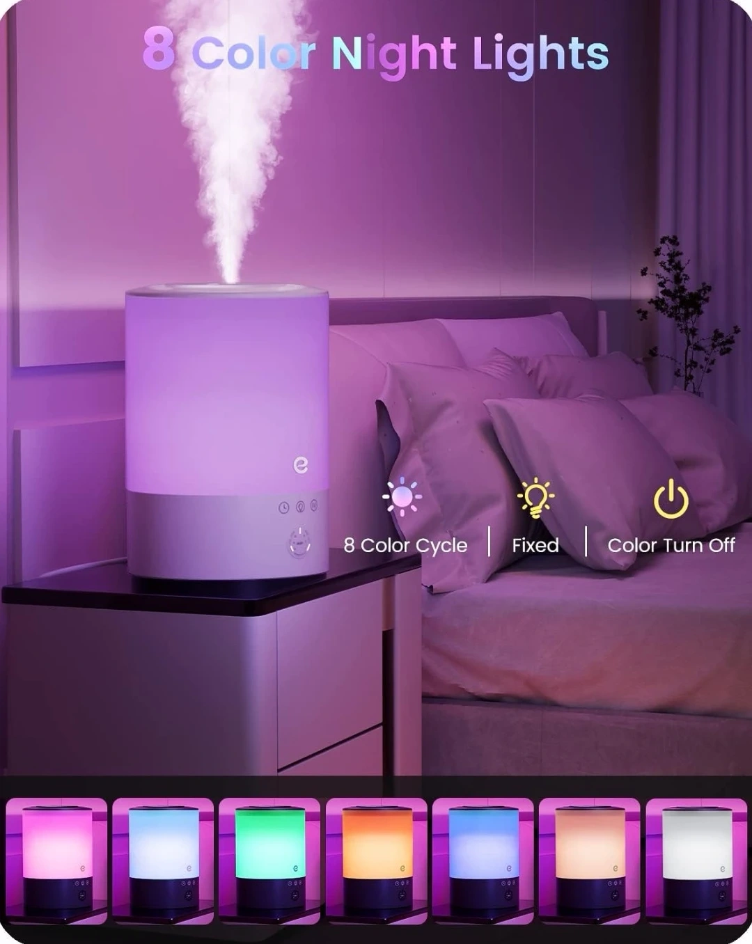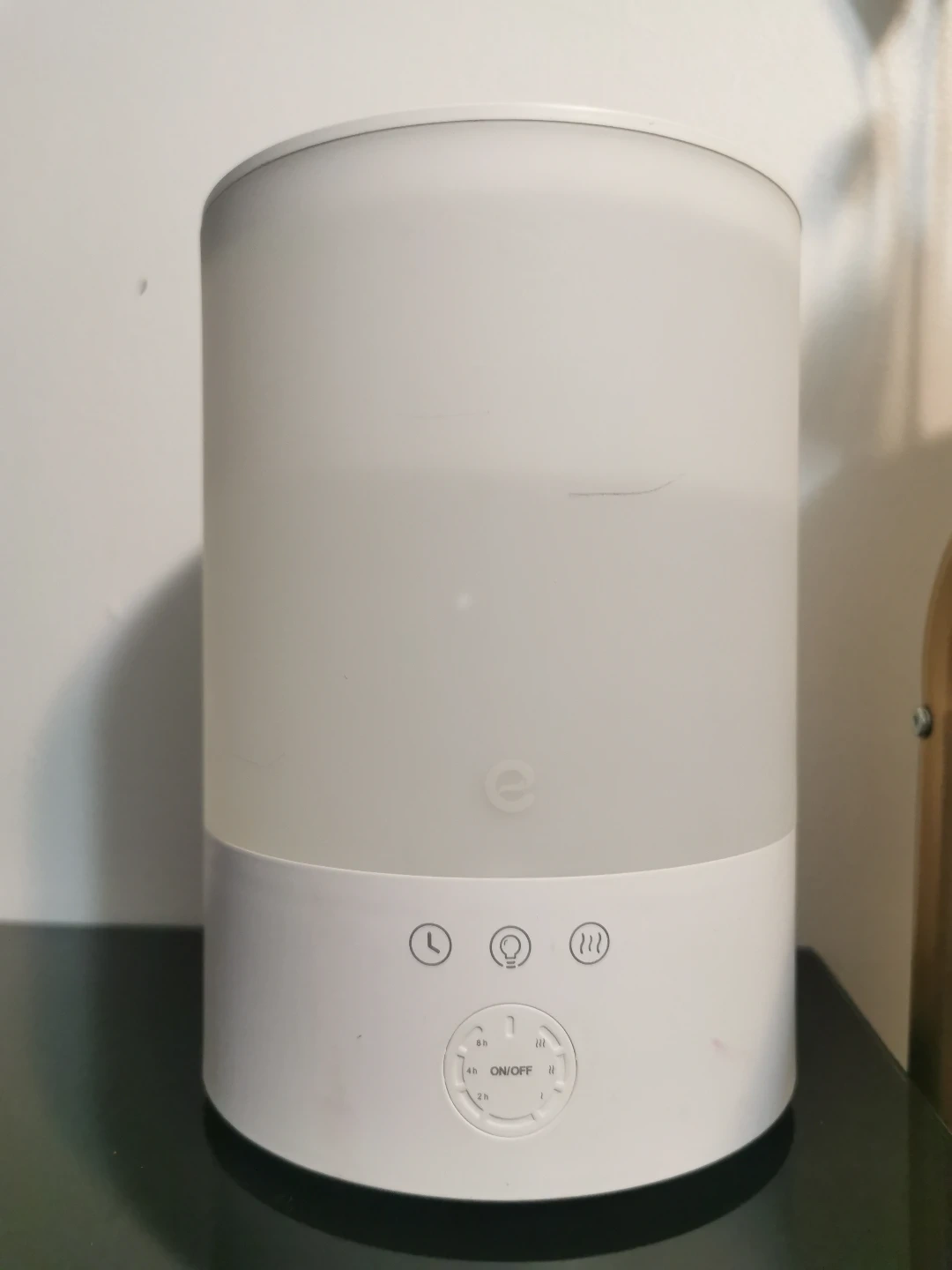 Compact humidifier. Features LED light and aroma diffuser functionalities. Multiple mist settings and timer options. Some minor cosmetic scratches.