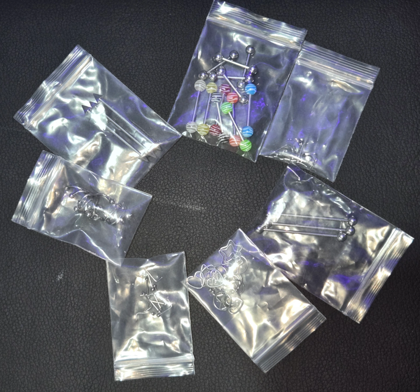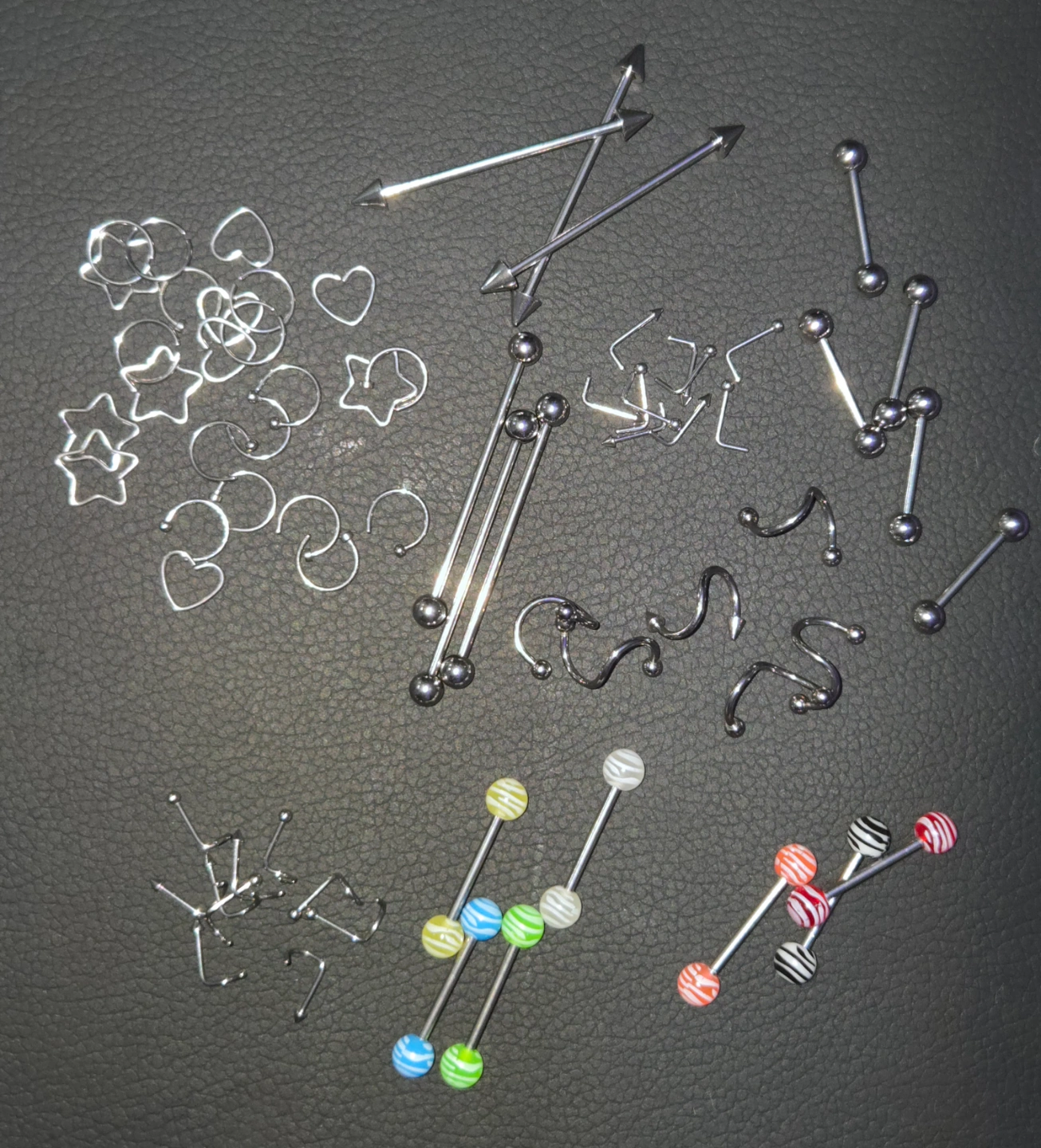 Large variety of piercings. Includes industrial barbells, labrets, captive bead rings, and more. Multiple colours and styles available. Sold as a bulk lot ($10 for seven bags)