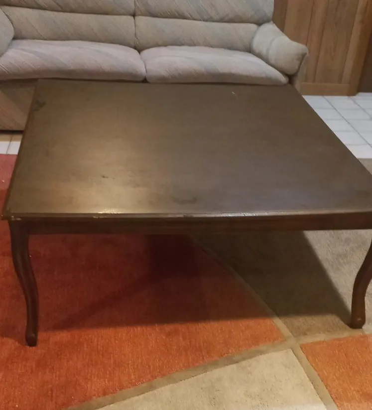 Square coffee table. Dark brown finish. Simple design. Features slightly curved legs.with glass.