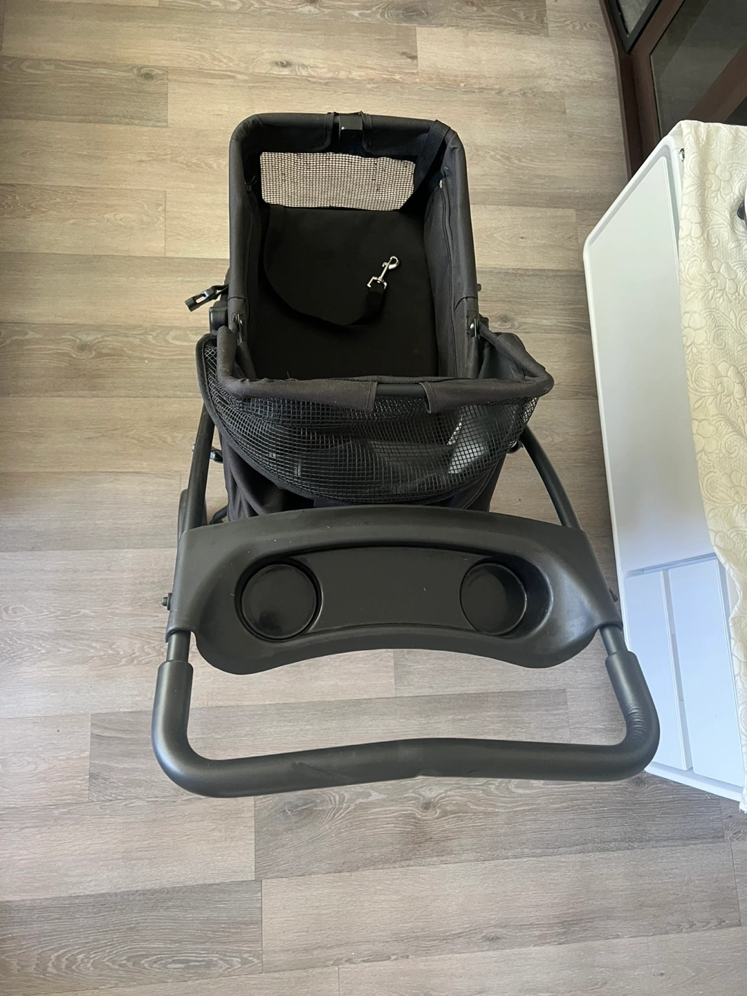 Foldable pet stroller. Black fabric. Two cup holders. Mesh sides for ventilation. Interior leash. and u can just it like a carrier