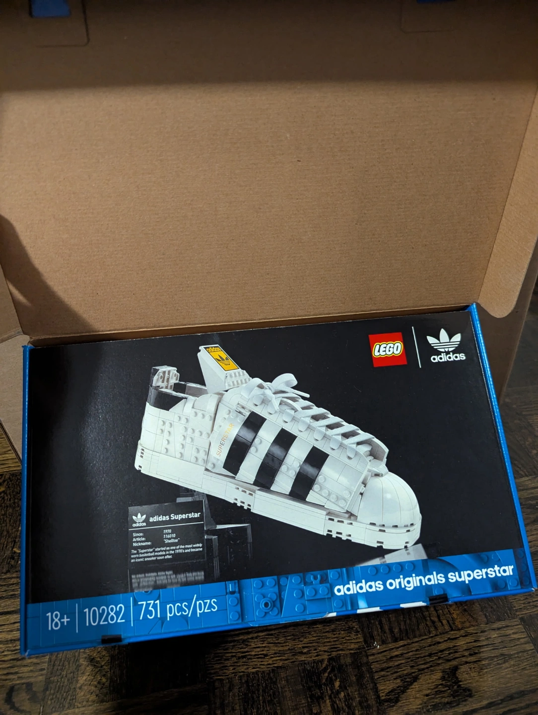 65New, sealed LEGO Adidas Originals Superstar building set. 731 pieces. For ages 18+. Collector's item.