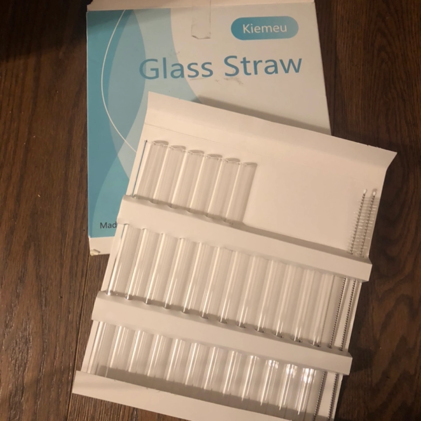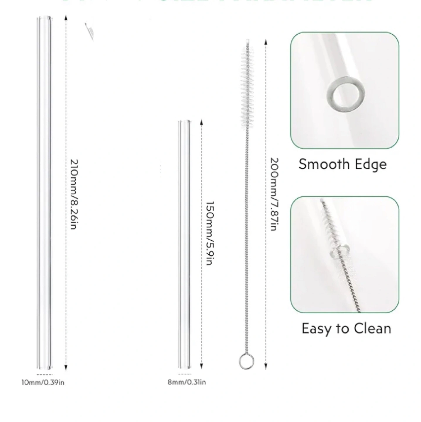 94Set of reusable glass straws. Includes two sizes and cleaning brushes. Smooth edges. Easy to clean. Great for everyday use.