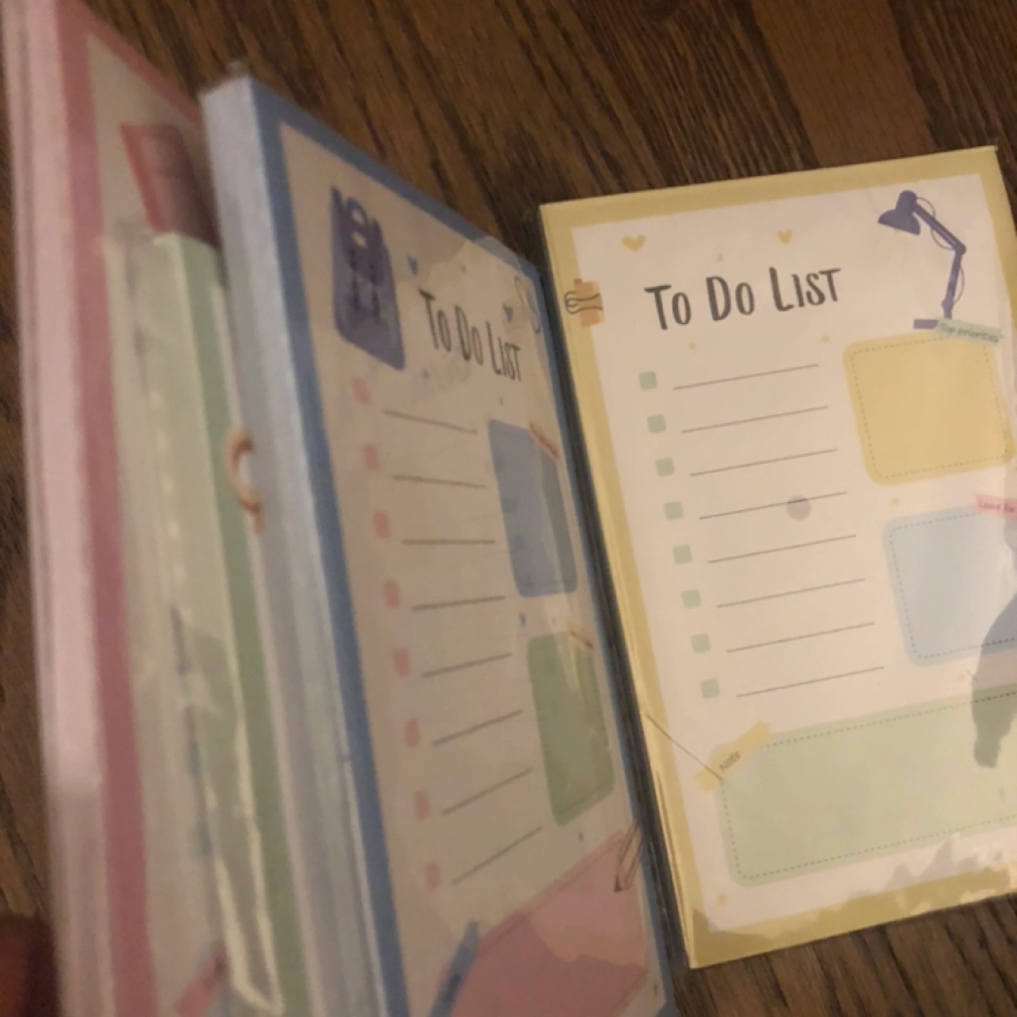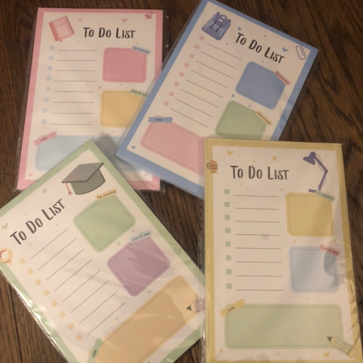 Four pastel-coloured to-do list pads. Each pad features a different design. Perfect for students or anyone who likes to stay organized.