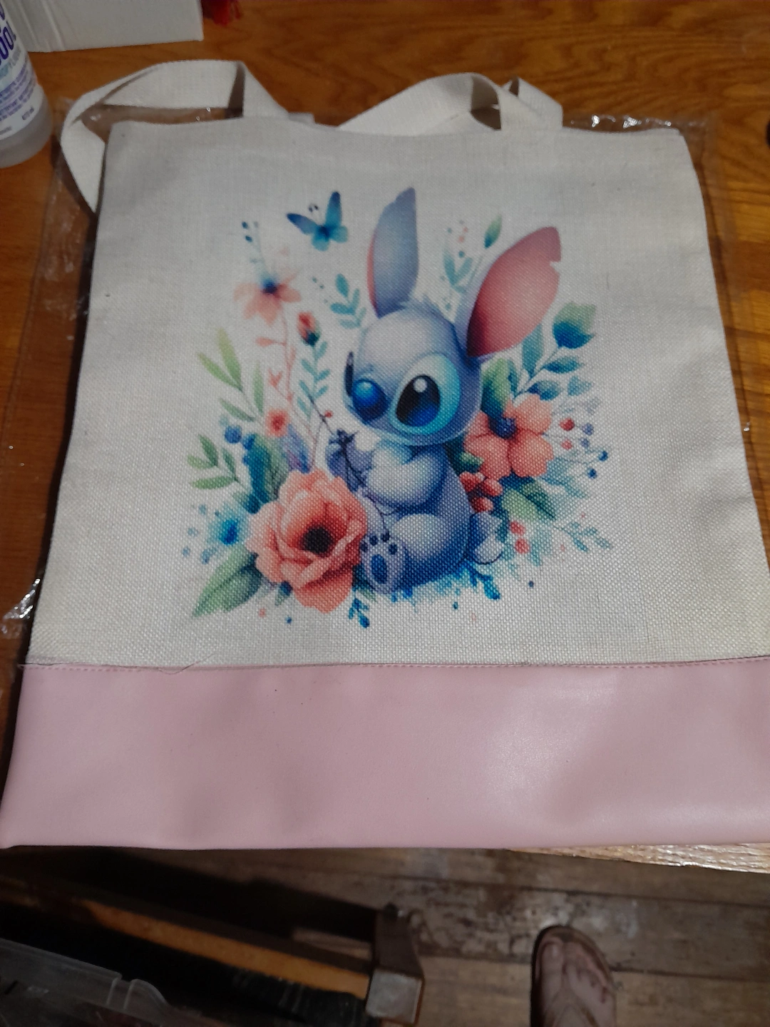 Set of two reusable tote bags. One features an autism awareness design with lips and a finger. The other features Stitch from Lilo & Stitch among flowers. Both have a coloured bottom. Great for shopping or carrying essentials.
