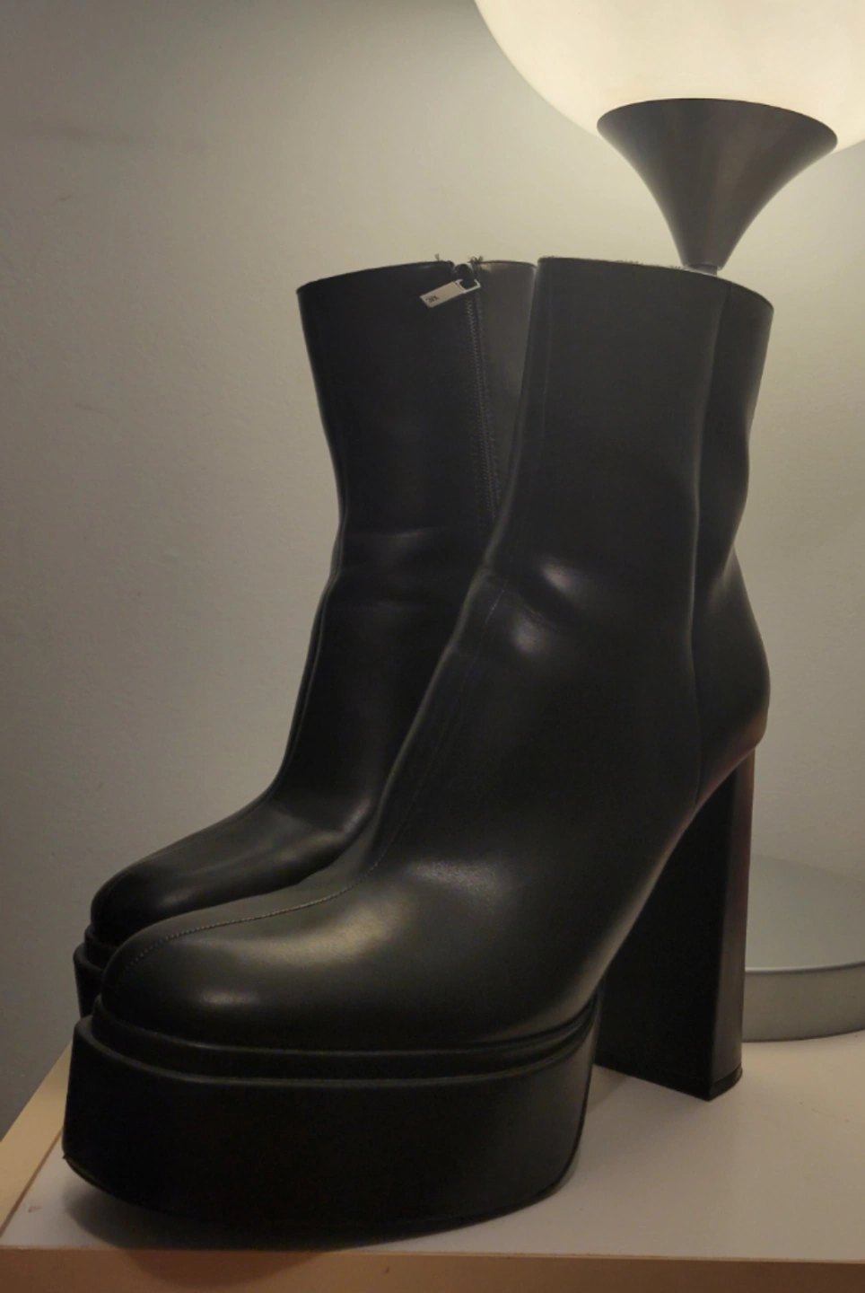 Pair of black vegan leather platform boots from Zara. Ankle-height with block heels and side zippers. 5 inch heel, 2 inch platform. Women's size 42 European or 11 US. Only worn once, with minimal signs of wear aside from minor scuffs. Pickup near Yonge & Finch