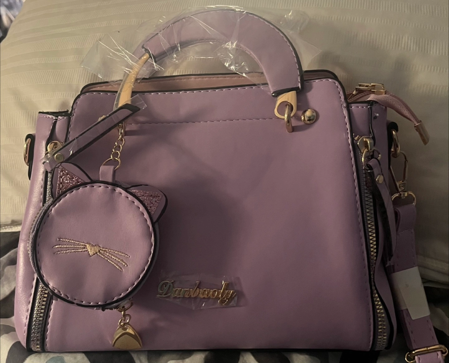 135Adorable lilac handbag. Features a top handle, detachable shoulder strap, and gold-toned hardware. Includes a cute cat-shaped coin purse. Zipper closures. New with tags. Cash only No returns or refunds All sales final Pick location King st west. And Dufferin area