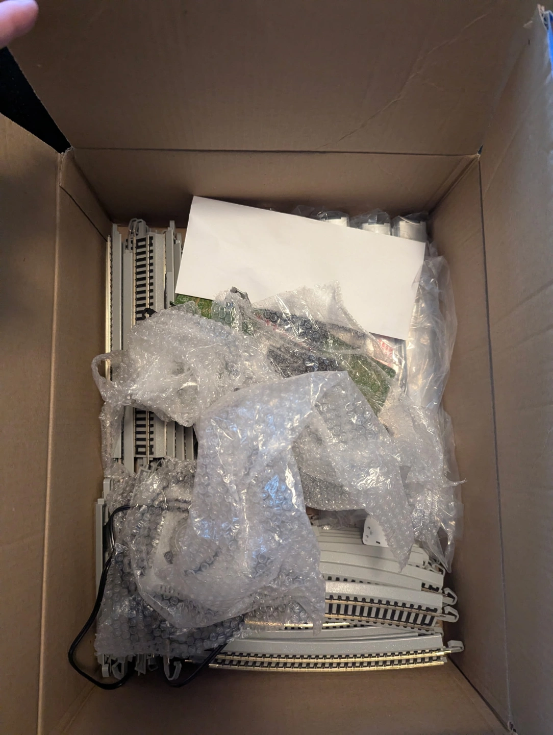 Box of HO scale train tracks, accessories, and bubble wrap. Contents appear to be new or gently used. Includes various track pieces and other components. Sold as is.