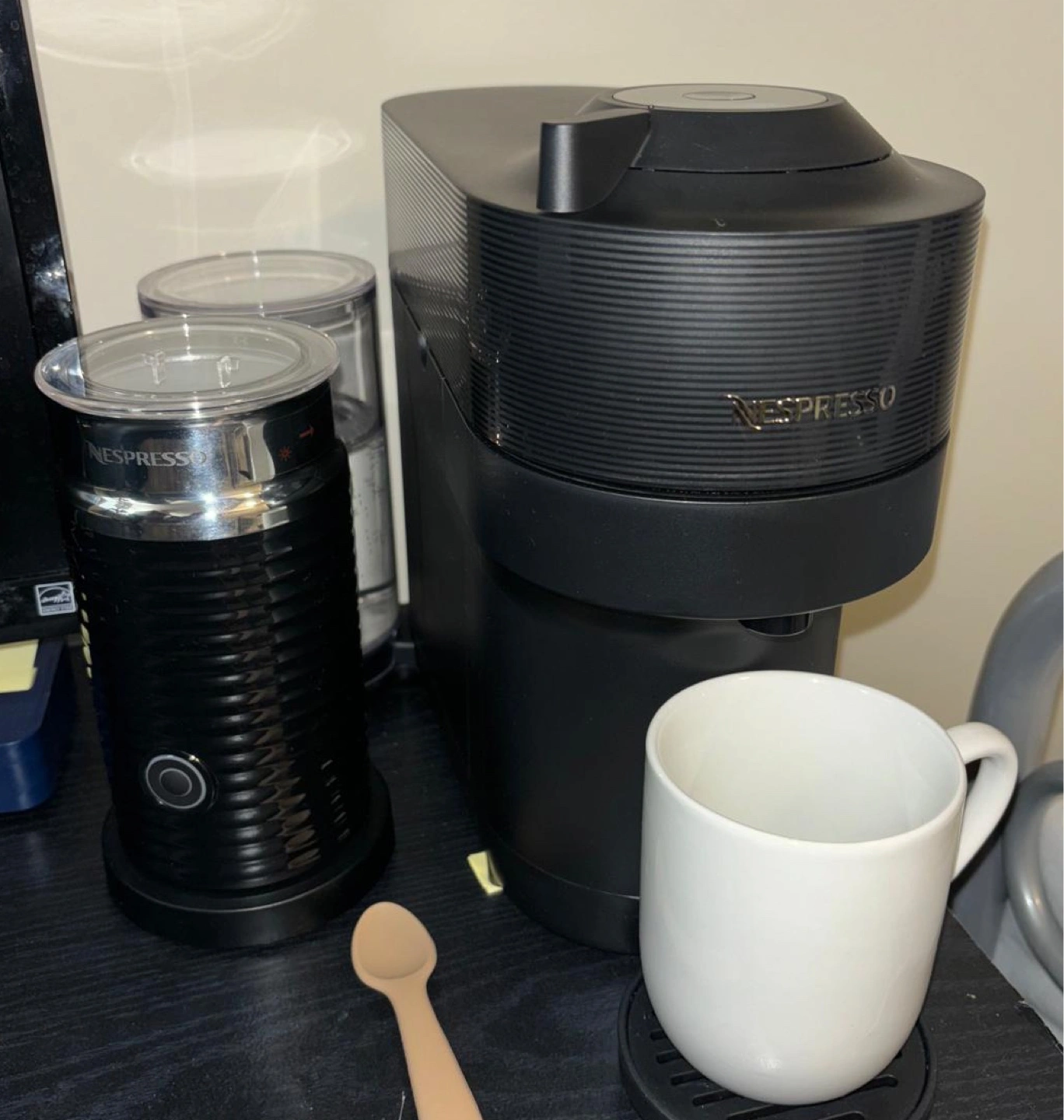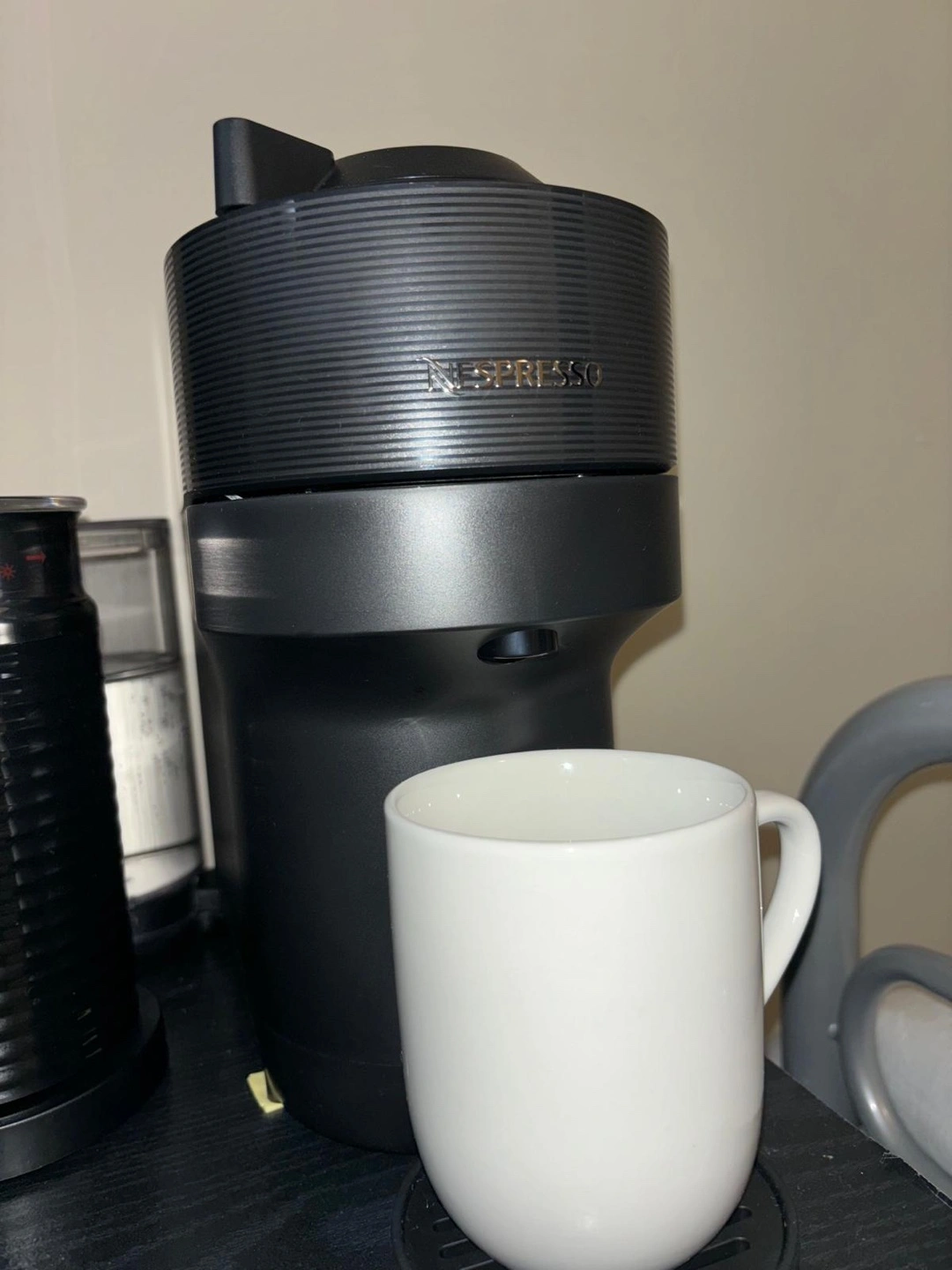 Black Nespresso coffee machine. Includes a matching Aeroccino milk frother. Makes delicious coffee and frothy milk. Compact design, perfect for small spaces.
