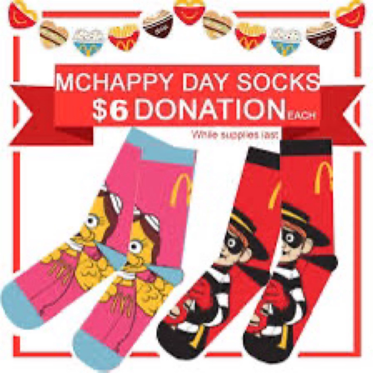 Pair of crew socks. Collective items from this year’s McHappy Day charity fundraiser. Prefer to sell them together. $10 for both or $6 each.