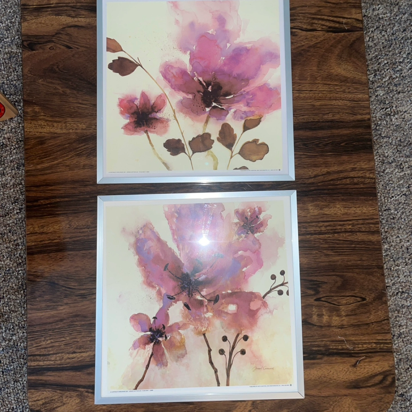 2 Beautiful framed watercolour copies. Features purple flowers on a cream background. Silver frame. Perfect for adding a touch of elegance to any room.