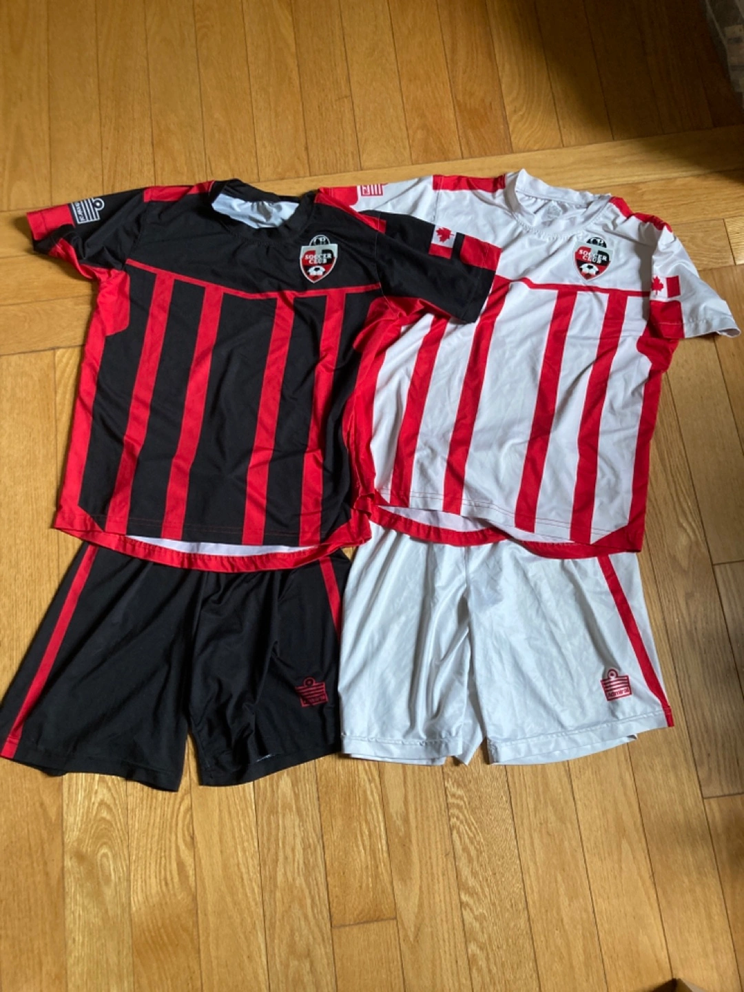 Two youth soccer jerseys and shorts sets. One black and red, one red and white. Youth size large approximately for ages 13-14. Excellent clean condition. Take both sets for $5!
