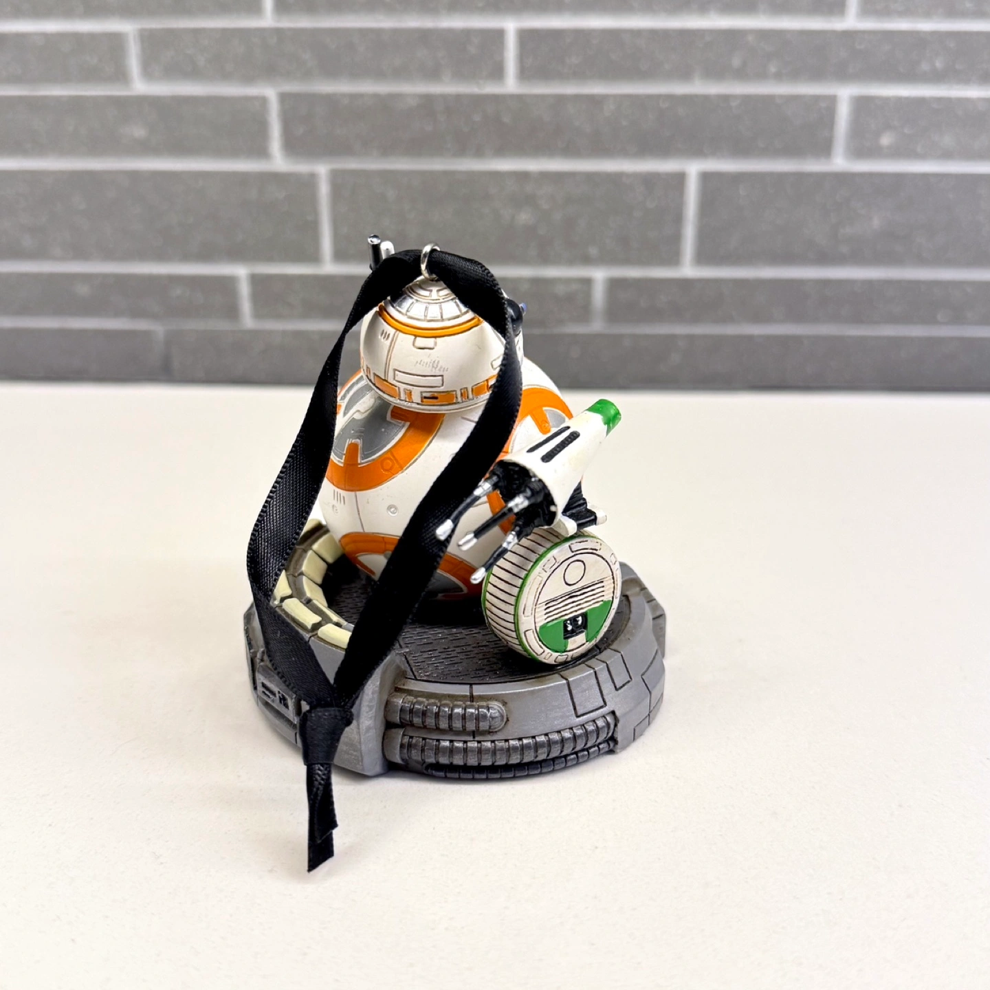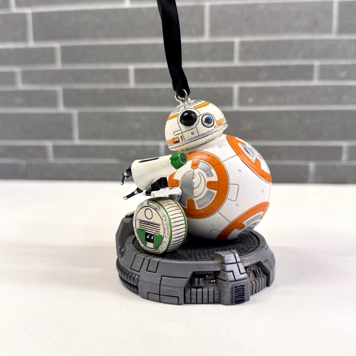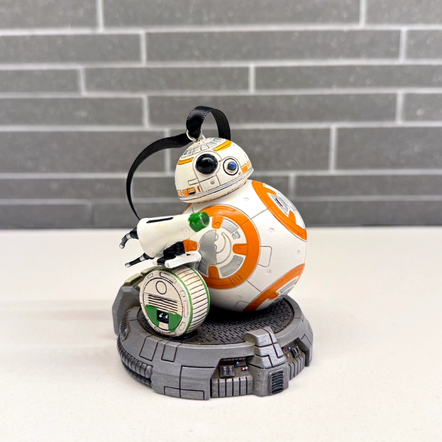 Adorable BB-8 ornament from the Disney World Store. Features BB-8 with his smaller droid friend. Black ribbon hanger. Collectible item. Perfect for the Star Wars fan.
