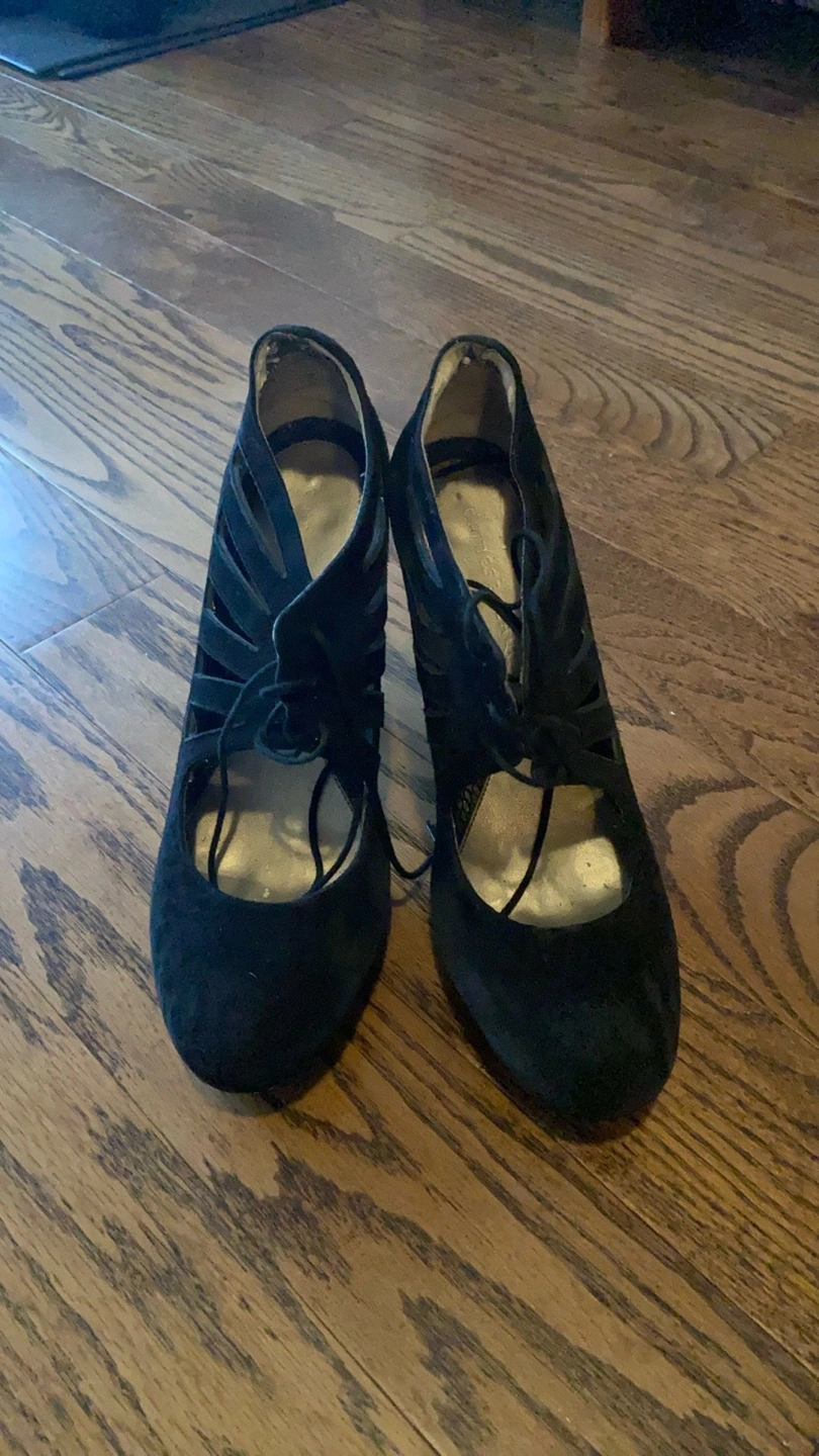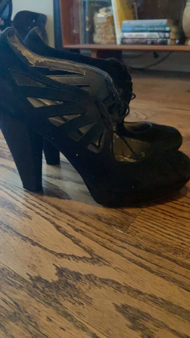 Pair of black suede high heels. Features a unique lace-up design and cut-out detailing. Chunky heels. Worn but in great condition!