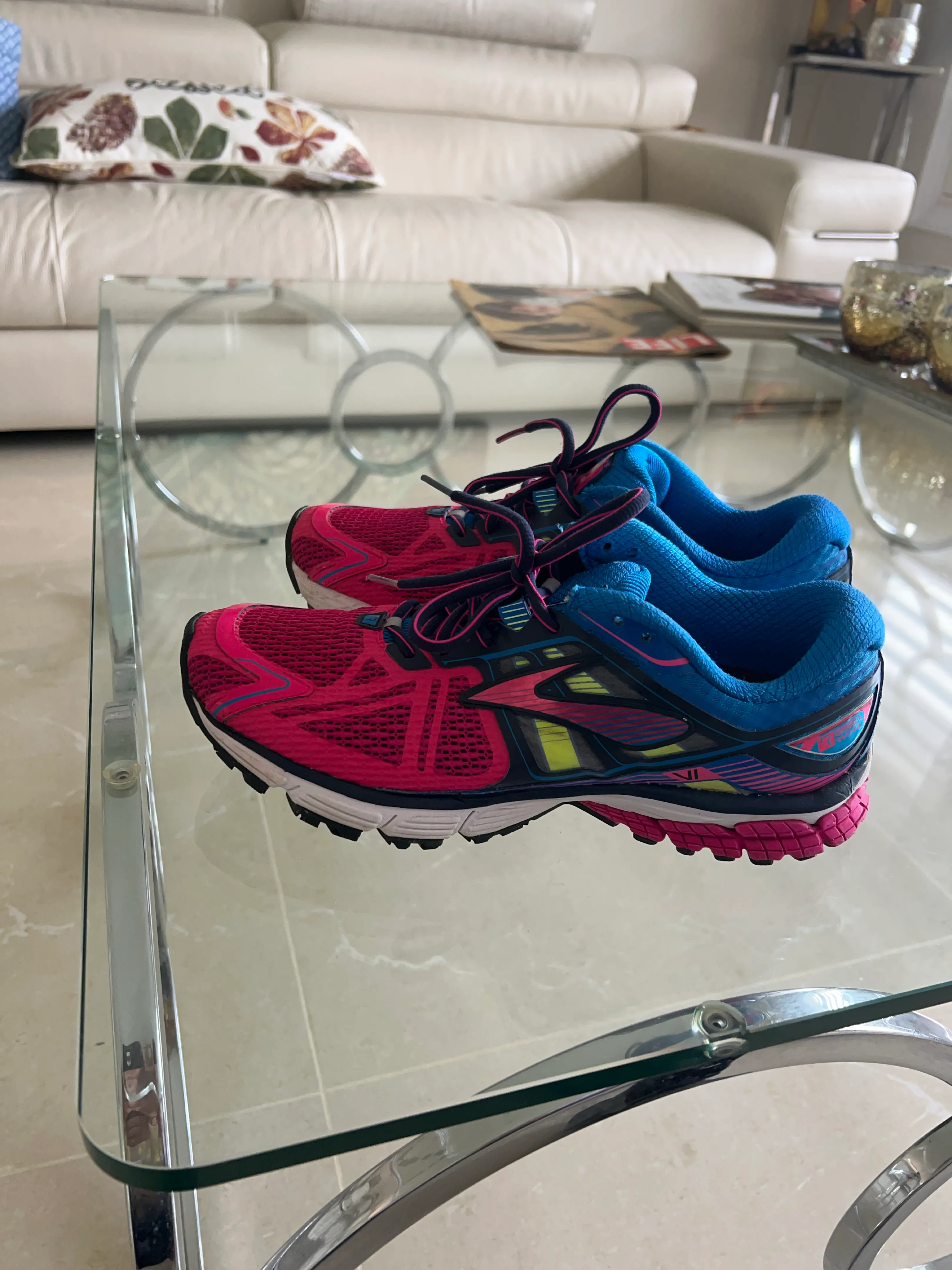 Pair of gently used Brooks running shoes. Pink and blue colour scheme. Great for running or casual wear.