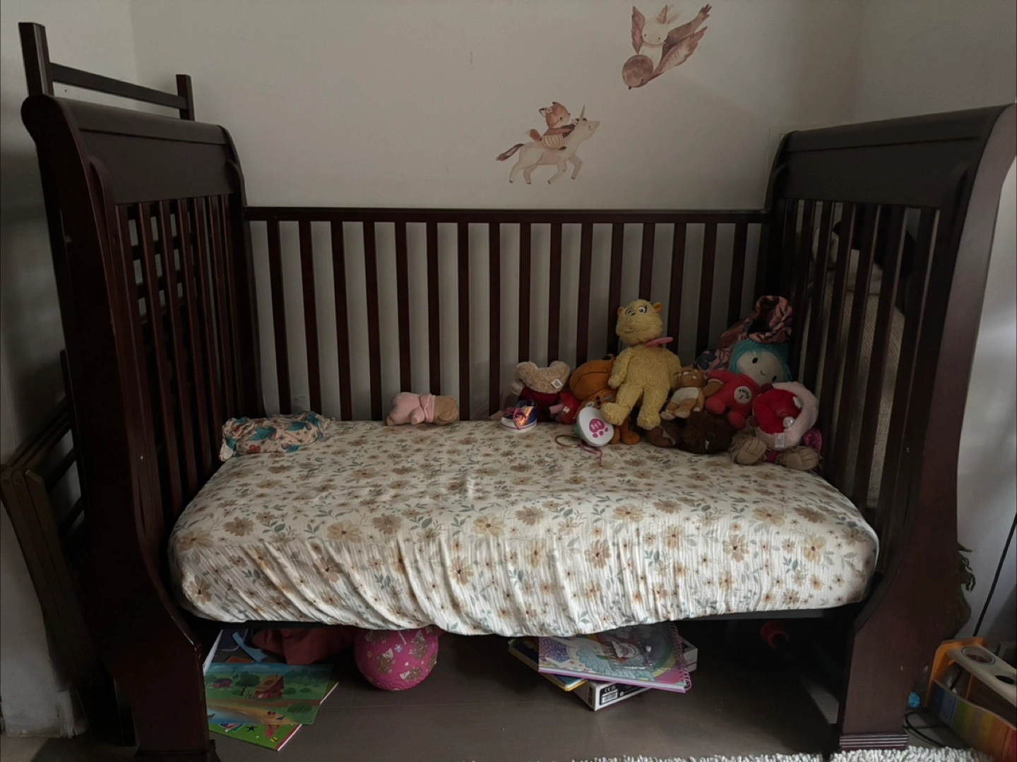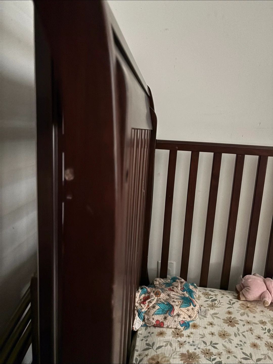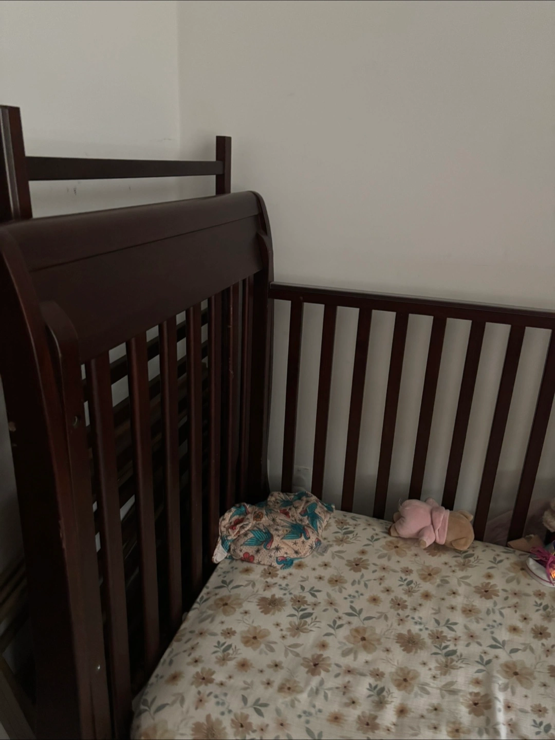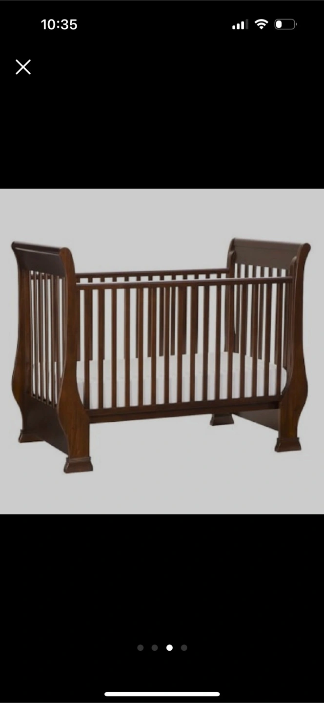 Dark brown wood sleigh crib. Used condition. Some minor scratches and wear. Includes a great mattress and 1 bedding sheets. You can regulate everything, you can take one part off so it’s gonna look like the picture.