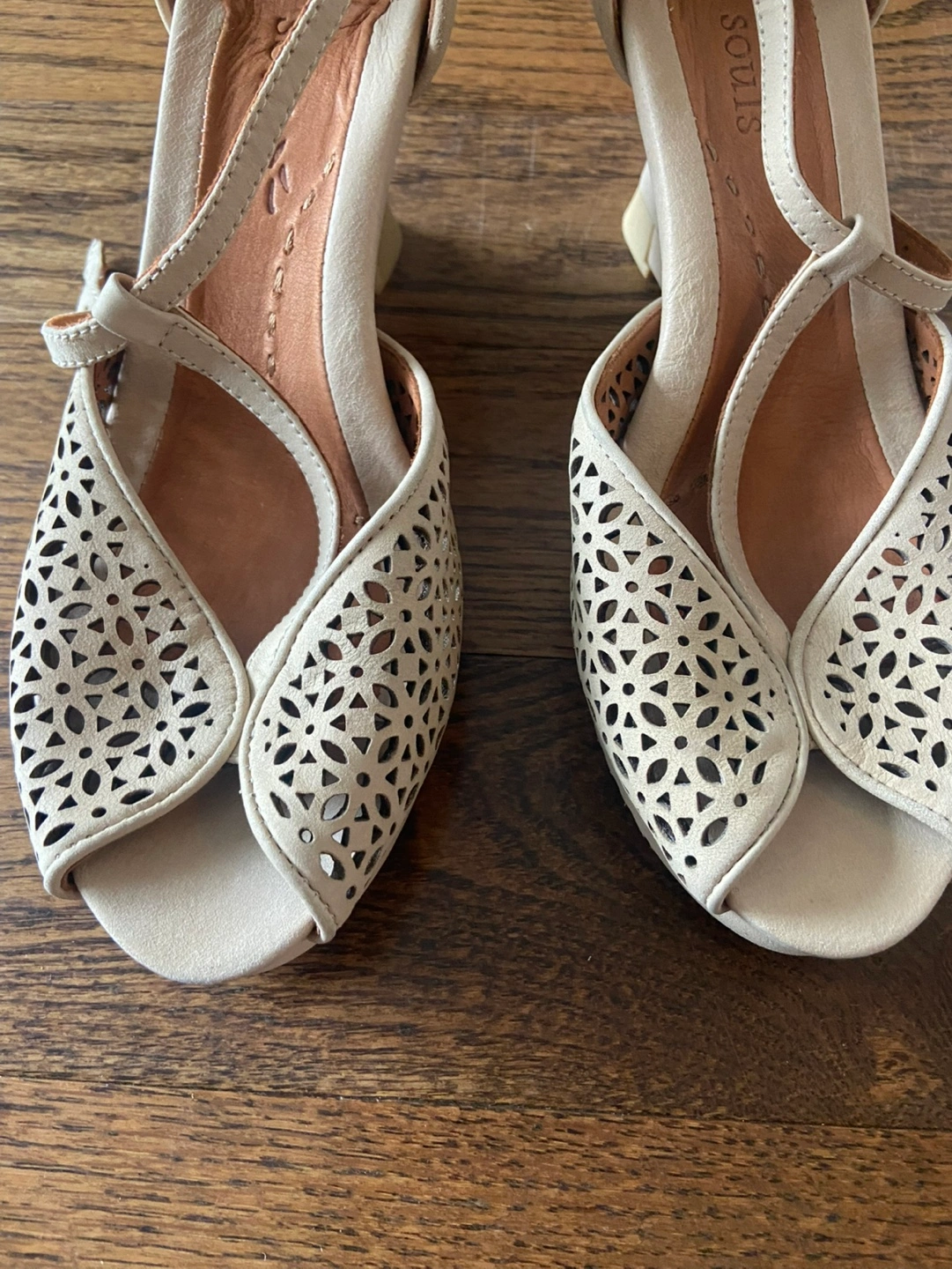 Stylish beige leather sandals for summer. Wedge heel. Laser cut detailing. Ankle strap closure. Open toe.