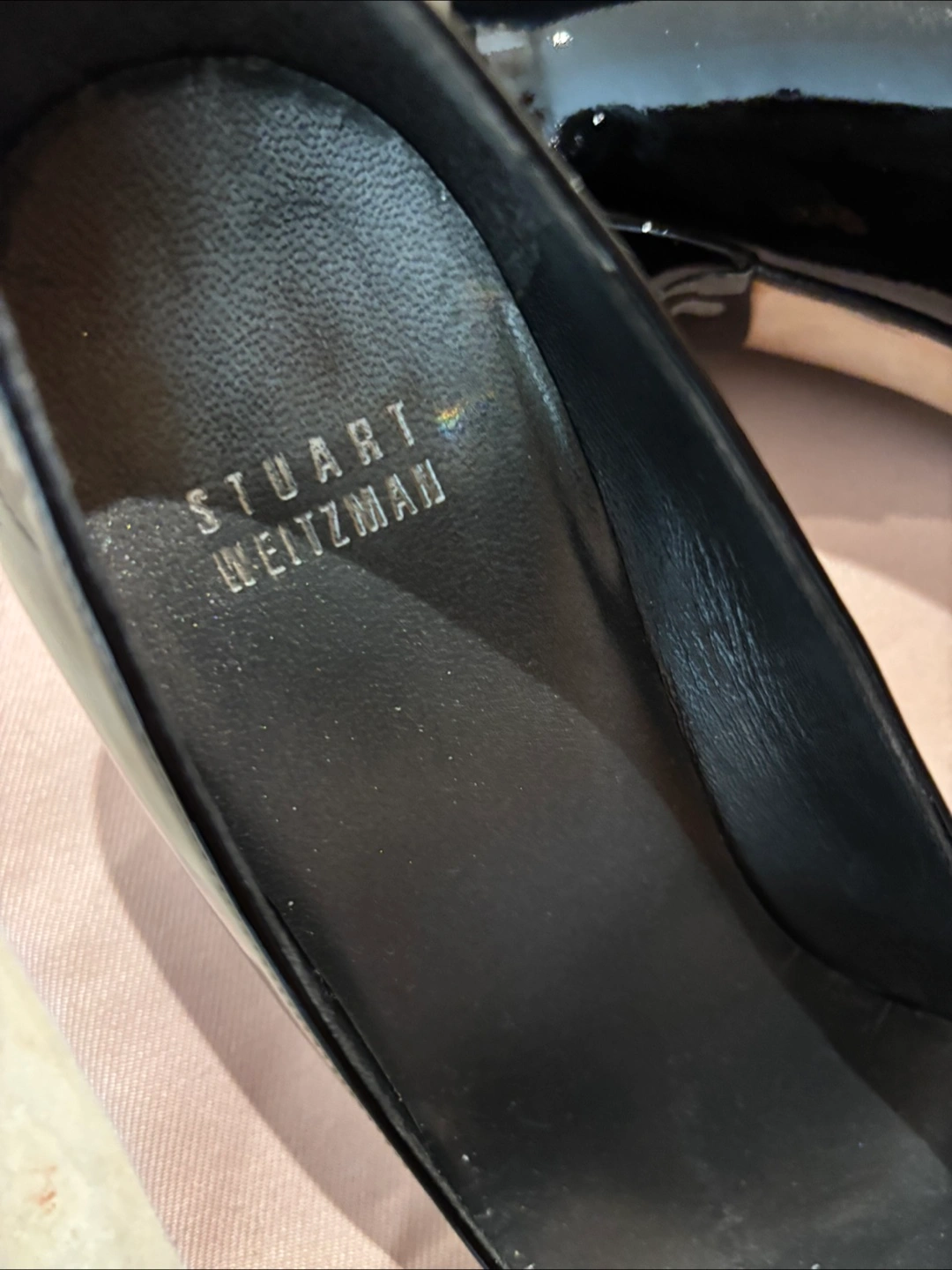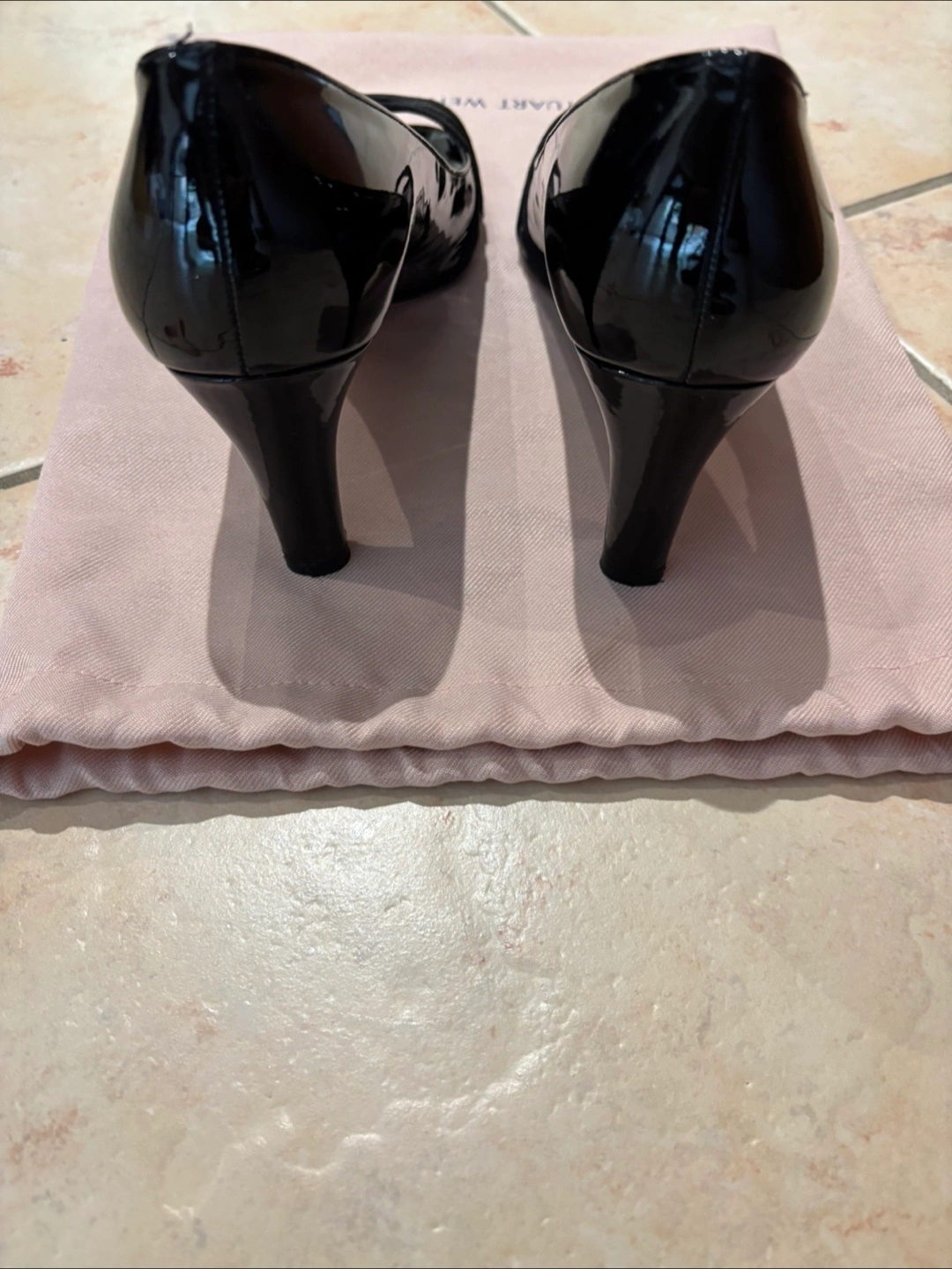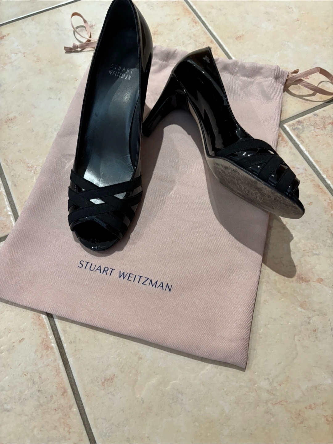 21Elegant black patent leather peep-toe heels. Cross-strap detail. Low heels. Comes with dust bag. Excellent condition.