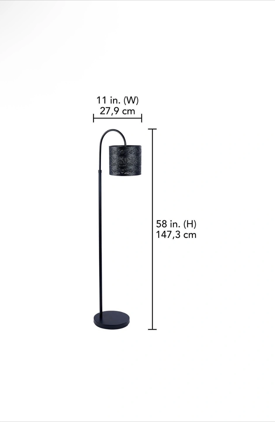 75Make any space brighter with hometrends Floor Lamp. Its durable metal base has a matte black finish and features a classic downlight design. A simple yet stylish metal mesh shade tops it all off, to complement the existing décor of any room. The ideal balance between style and function, it also has a convenient in-line switch. From bedrooms to offices, living rooms and rec rooms, it’s the perfect lamp for any space. Features a classic design with matte black finish Metal lamp base with a metal mesh shade In-line switch Height: 58 in. Lamp shade size: 9 in. x 9 in. x 8 in. Recommended bulb 100 Watts Type A or 16 Watts LED, bulb not included Pick up in Mississauga near the intersection of Highways 401 and 403