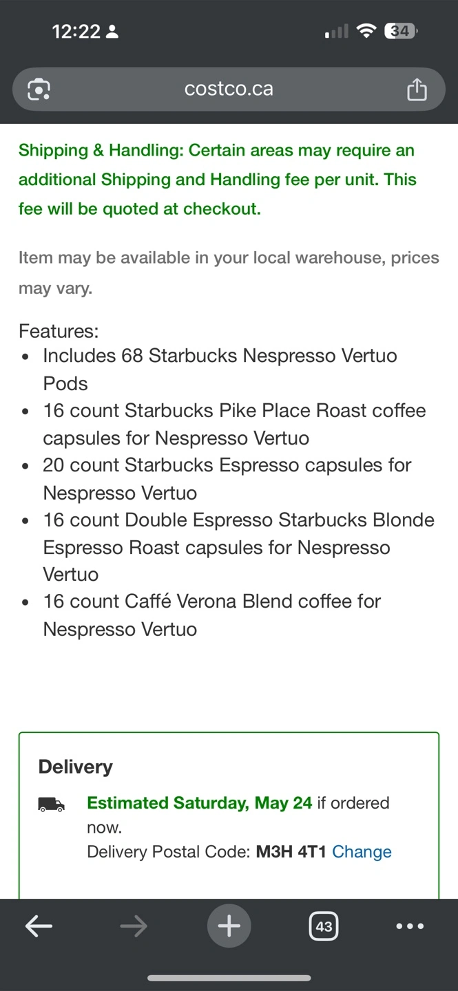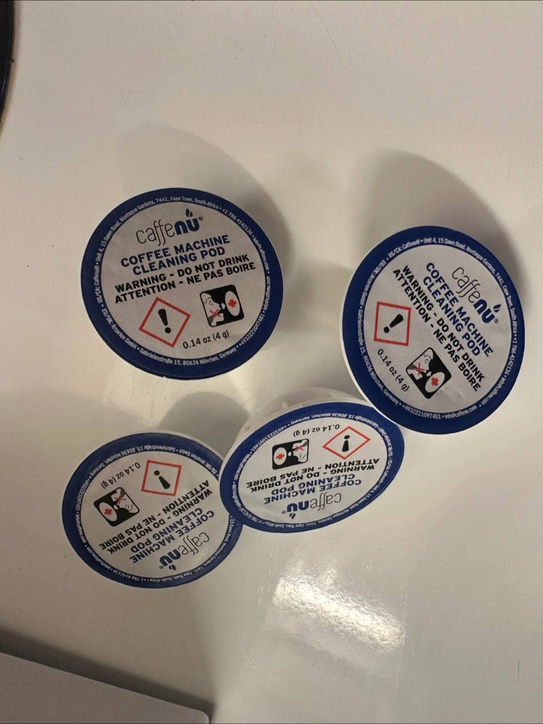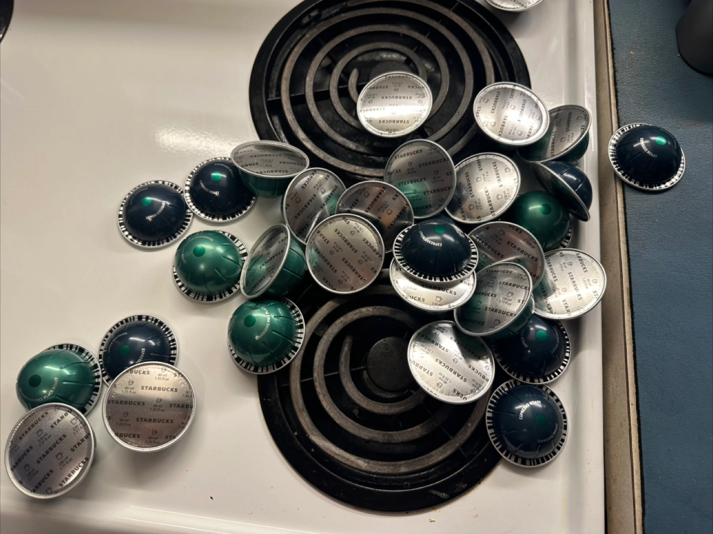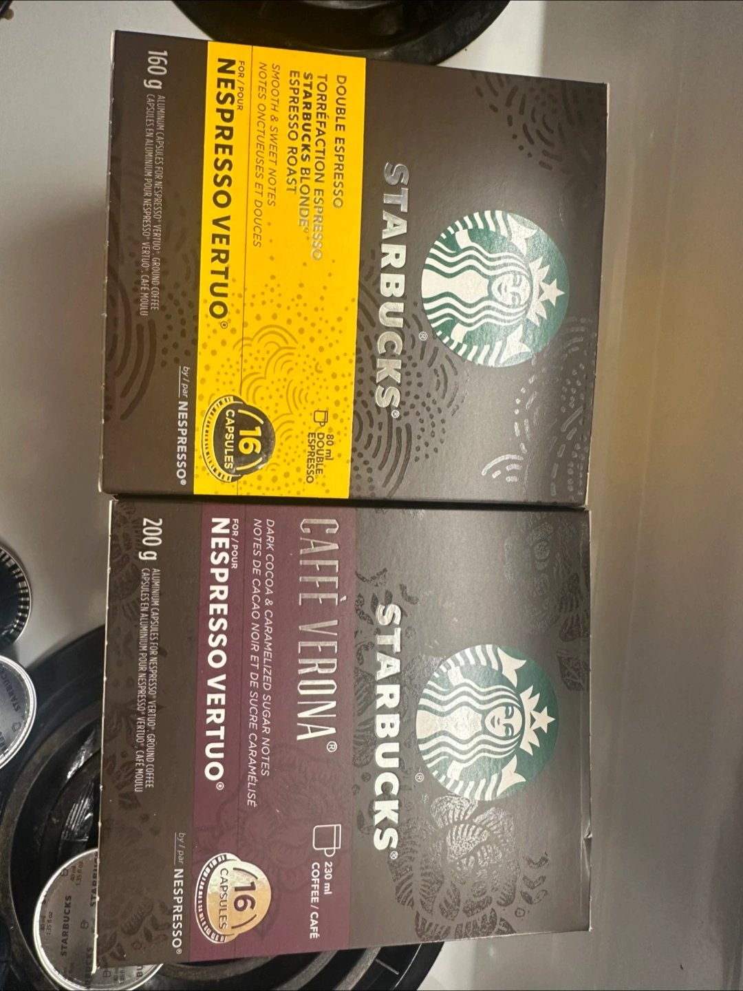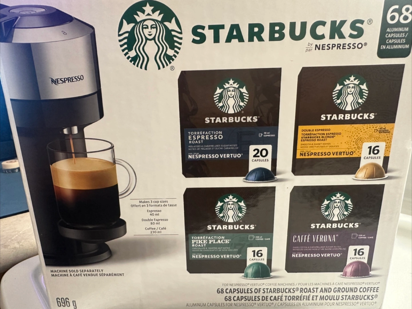 Starbucks Nespresso Vertuo capsules. Includes Pike Place Roast, Espresso Roast Blonde, Double Espresso, and Caffè Verona. Plus three Caffenu cleaning pods.