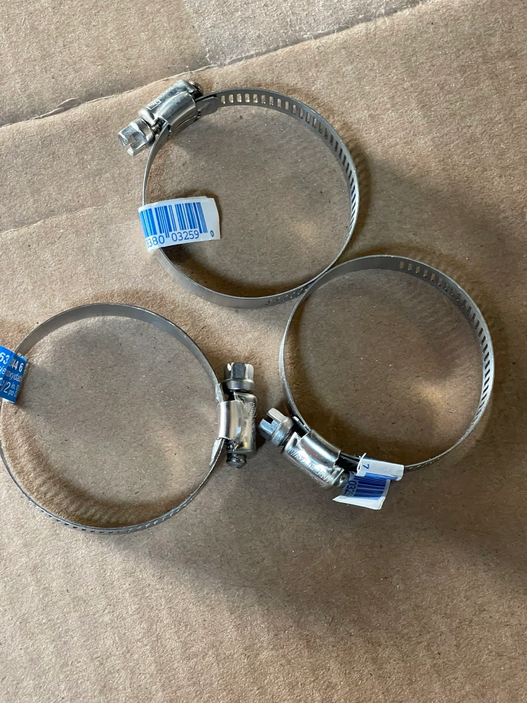 Three stainless steel hose clamps. Size range: 1-9/16" to 2-1/2" outer diameter. Used, but in good condition.