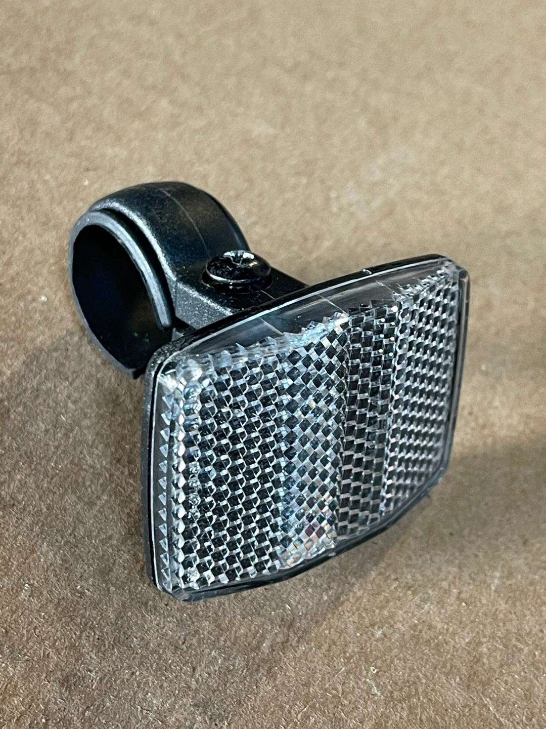 Two bicycle reflectors. Clear plastic with a grid pattern. Black plastic mounts. Attaches to handlebars or seat post.