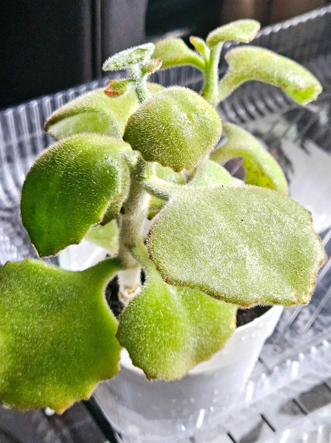 Fuzzy green leaves. Small potted plant. Perfect for a desk or windowsill.