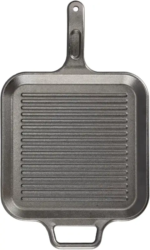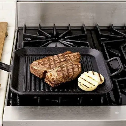 12-inch pre-seasoned cast-iron square grill pan; raised ridges allow fat to drain