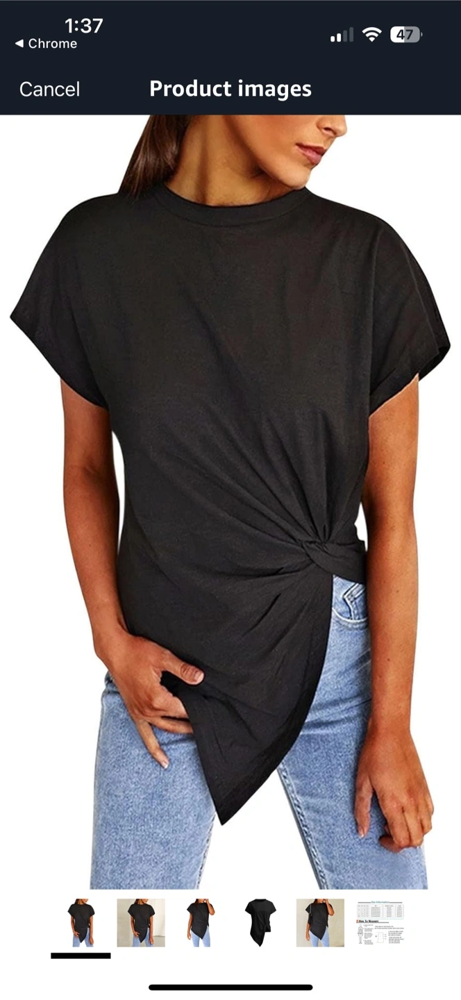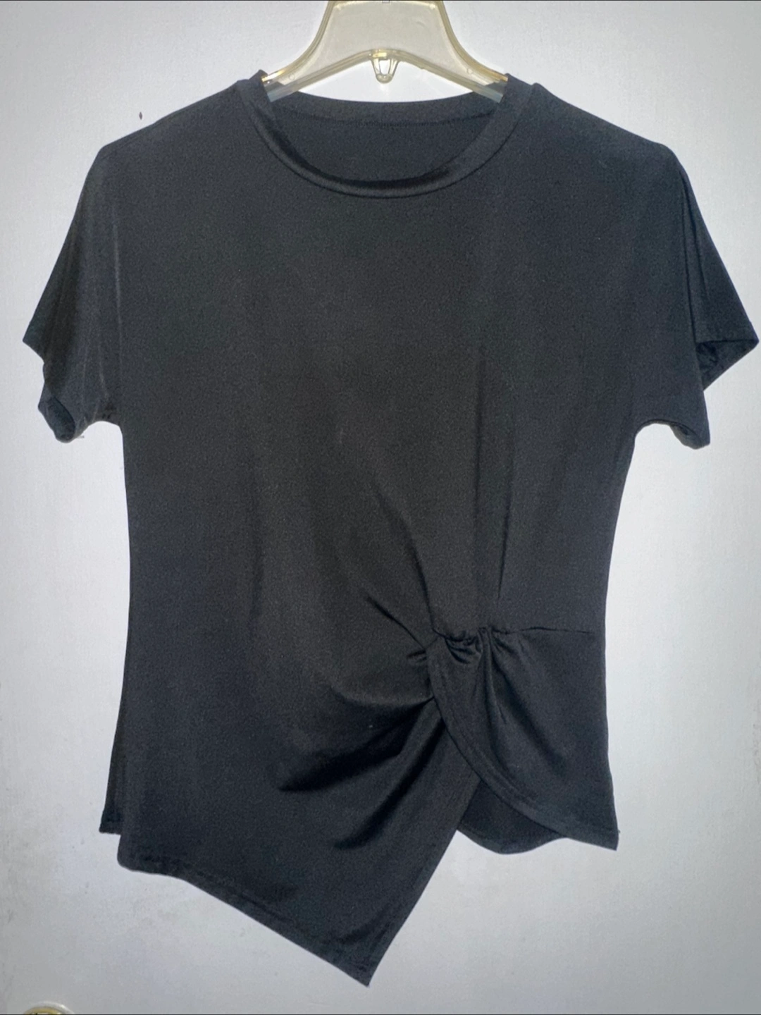 Short sleeve, black t-shirt. Knotted detail at the front. Asymmetrical hem.