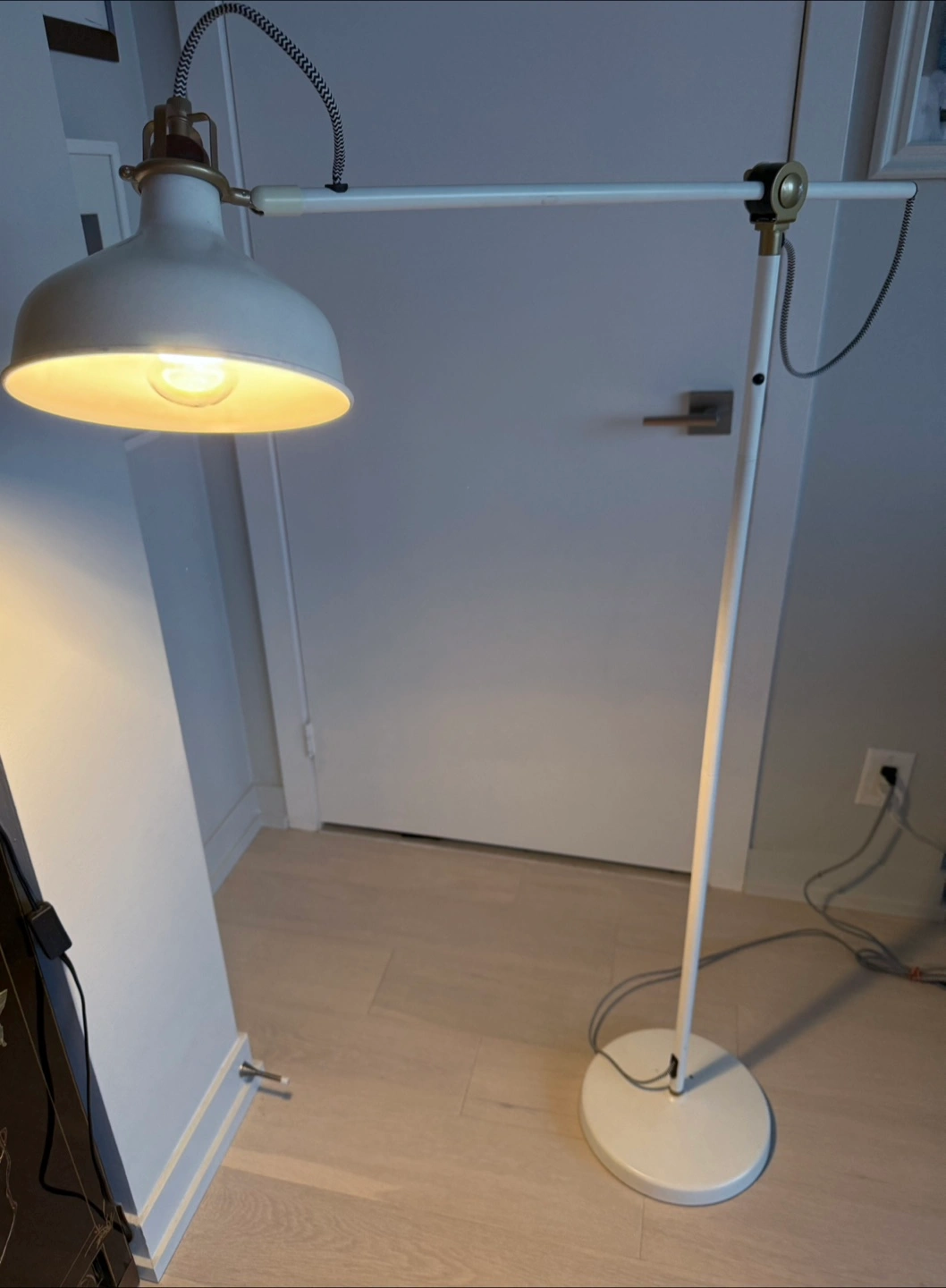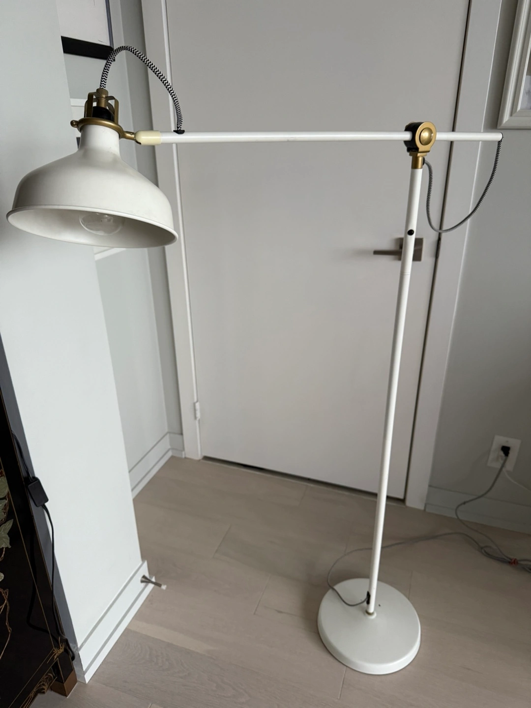 Modern floor lamp. White finish with brass accents. Adjustable arm and height. Excellent for reading or ambient lighting. Simple design. It has a little tiny chip on the base.