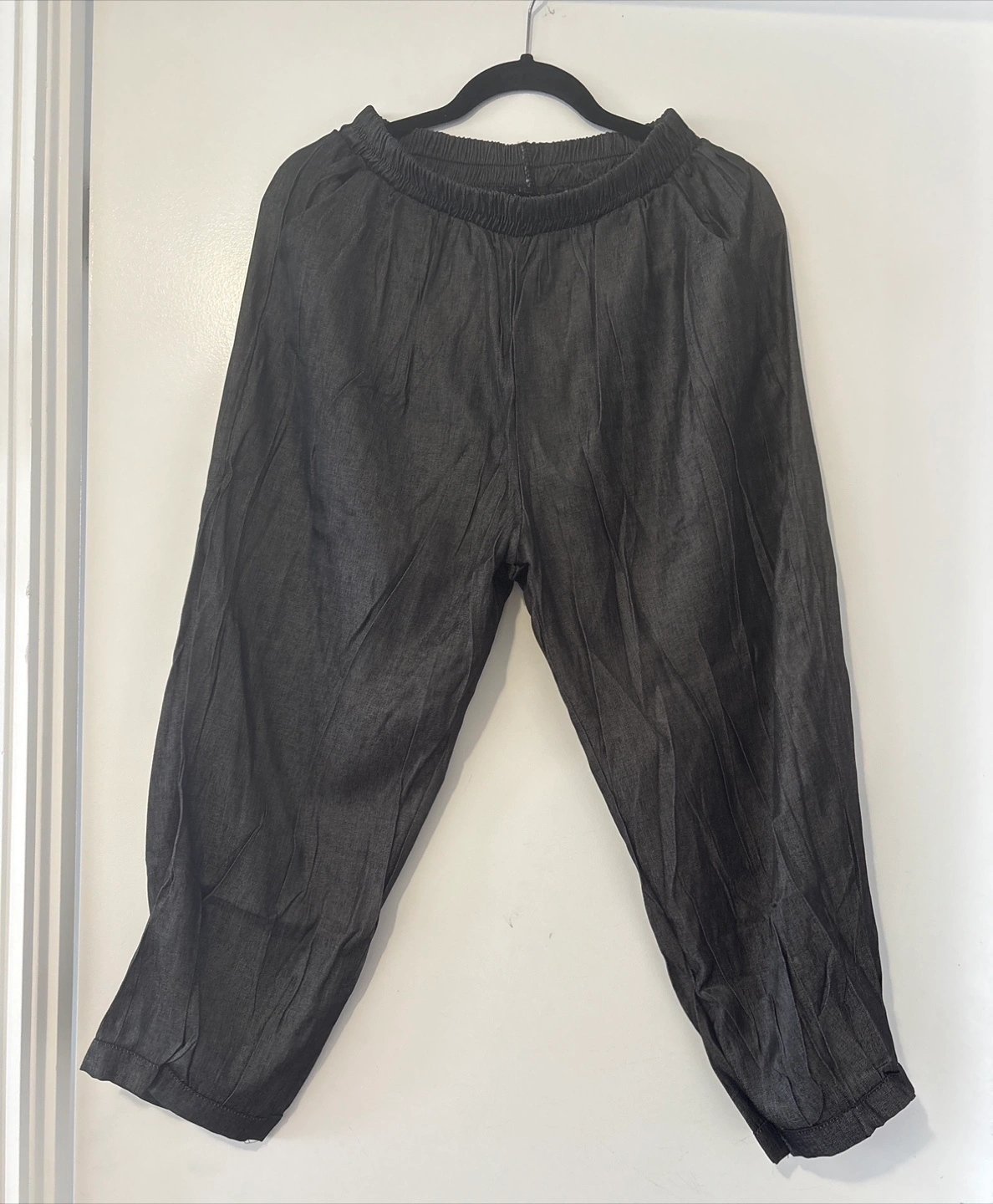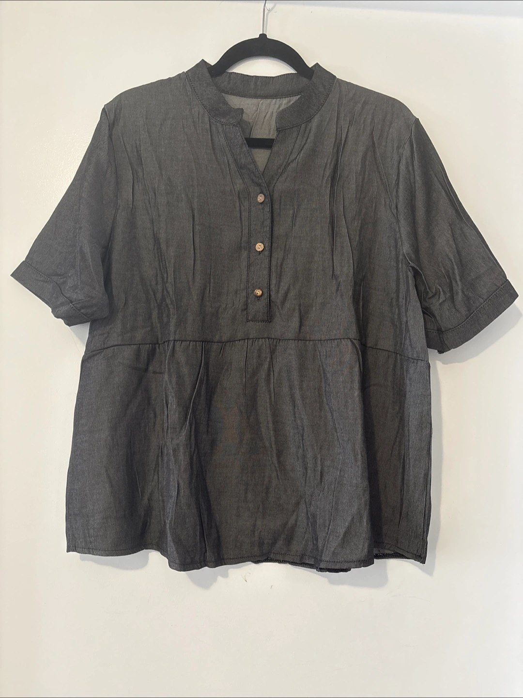 Matching dark grey denim top and capri pants. Short-sleeved peasant-style top with button placket. Elastic waistband capris. Casual, comfortable outfit.