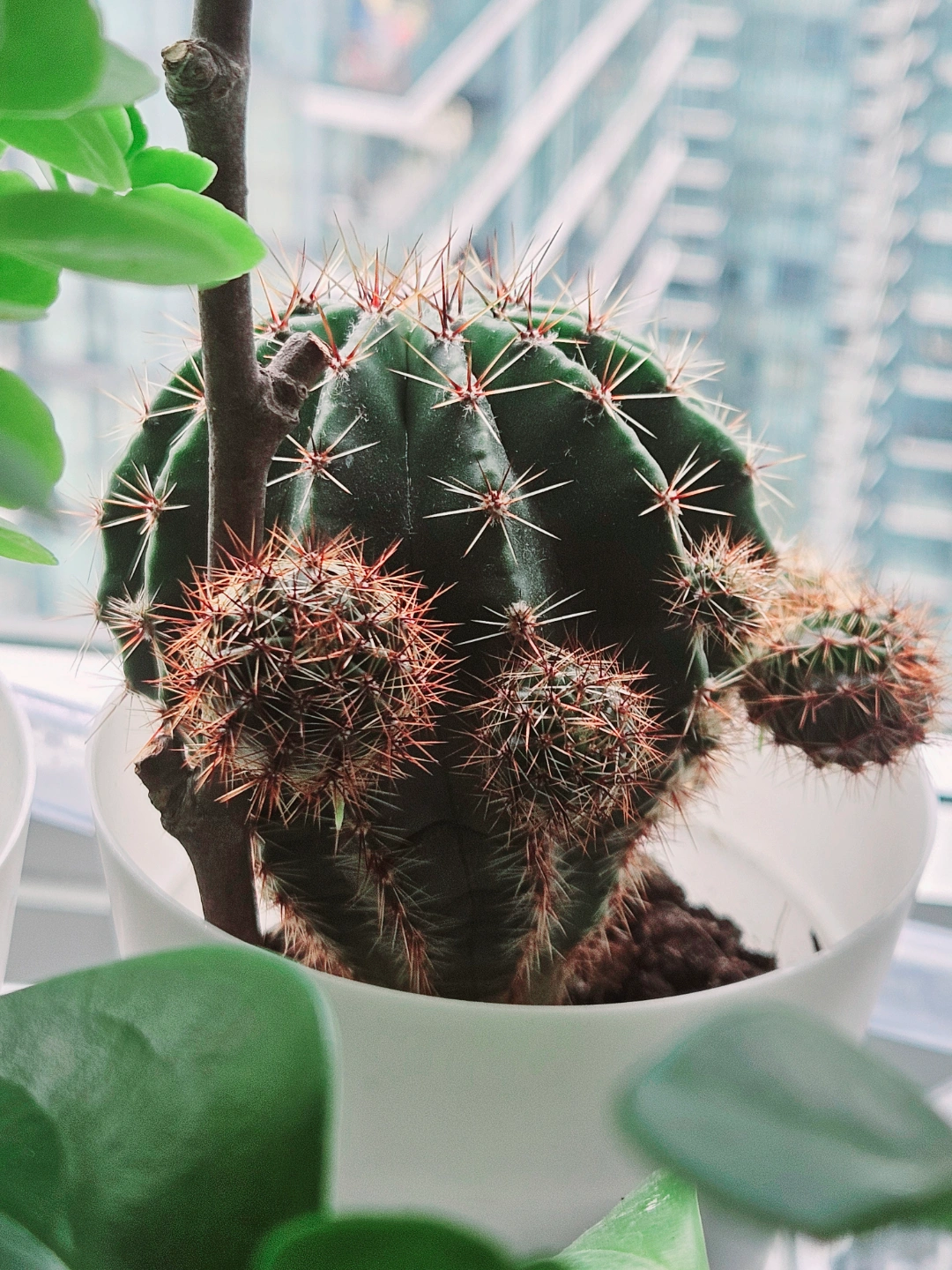Small cactus plant in a white pot. Potted plant, ideal for a windowsill.
