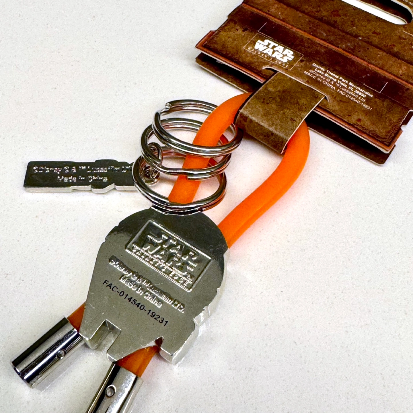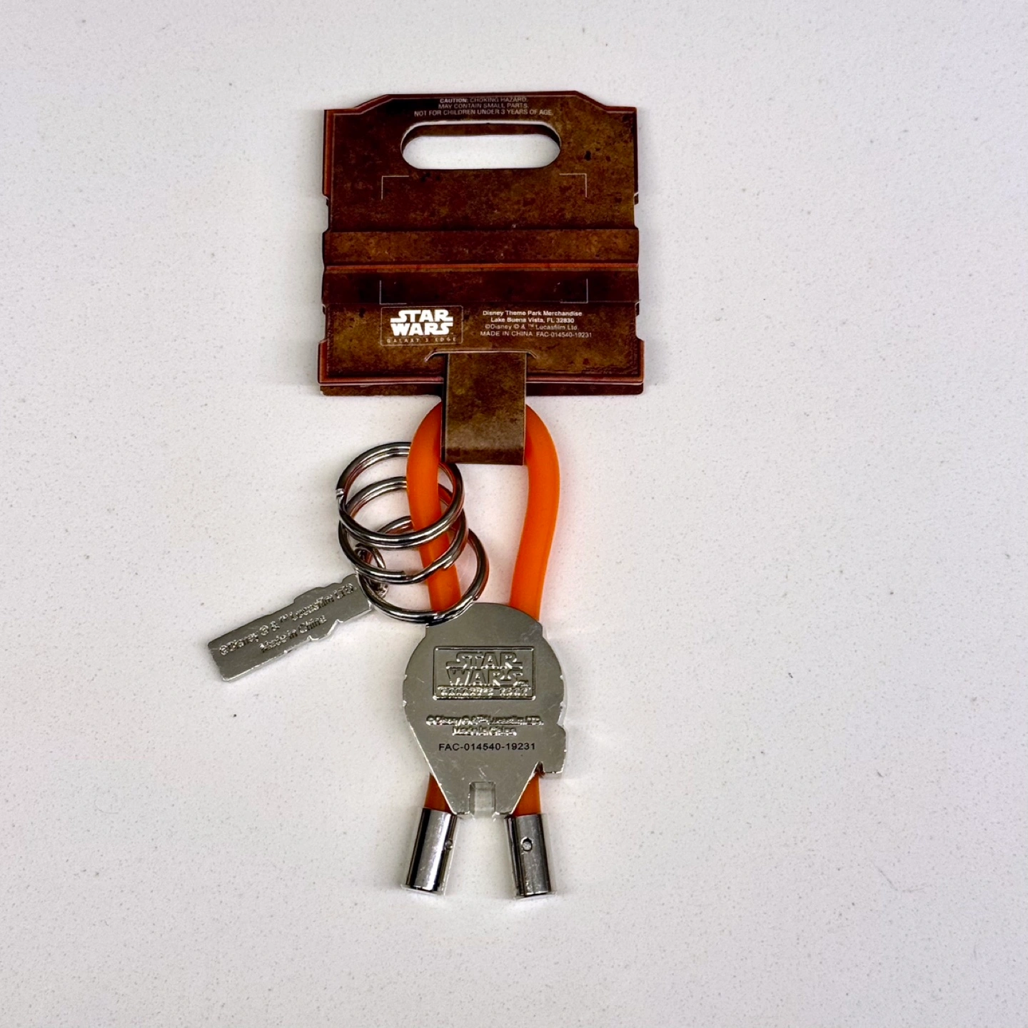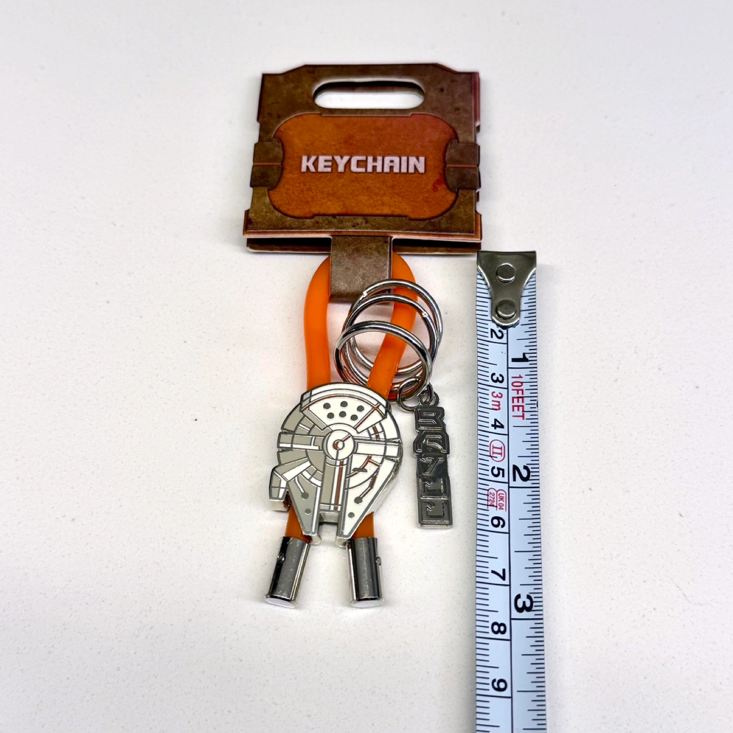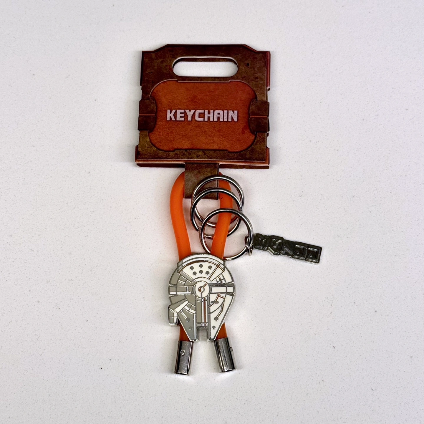 New Star Wars Millennium Falcon keychain. Features an orange silicone strap and metal charm. Comes on original packaging.