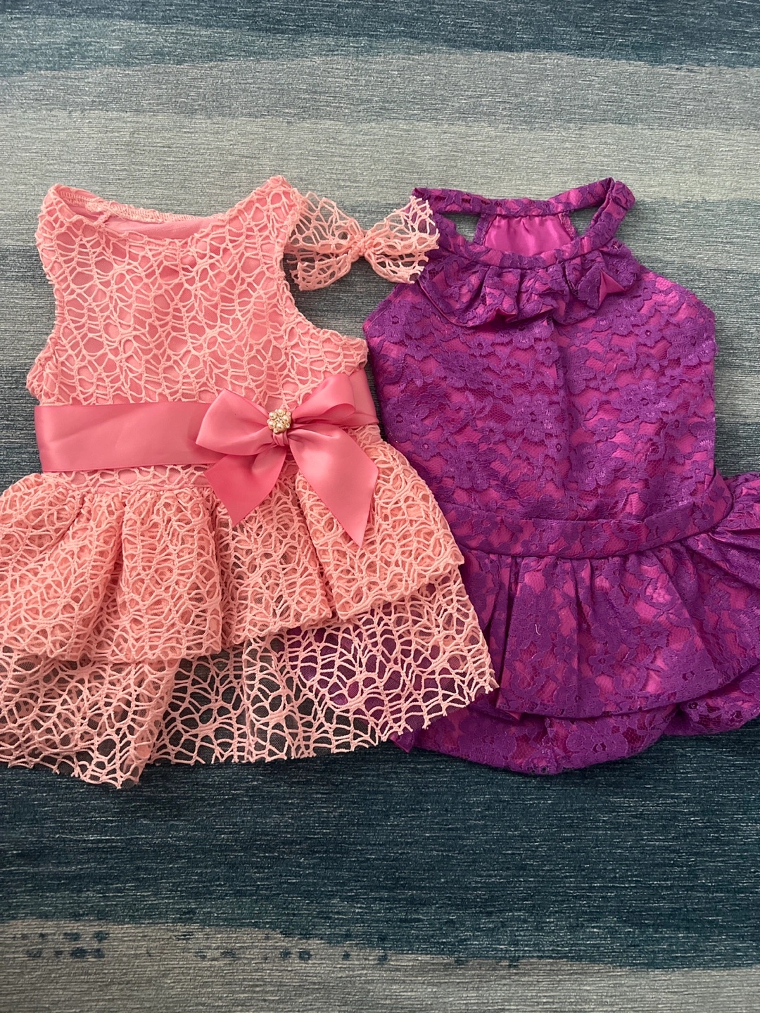 Two adorable layered lace dresses. Pink dress features a satin ribbon bow. Purple dress has a ruffled neckline. Both are sleeveless. Size Medium
