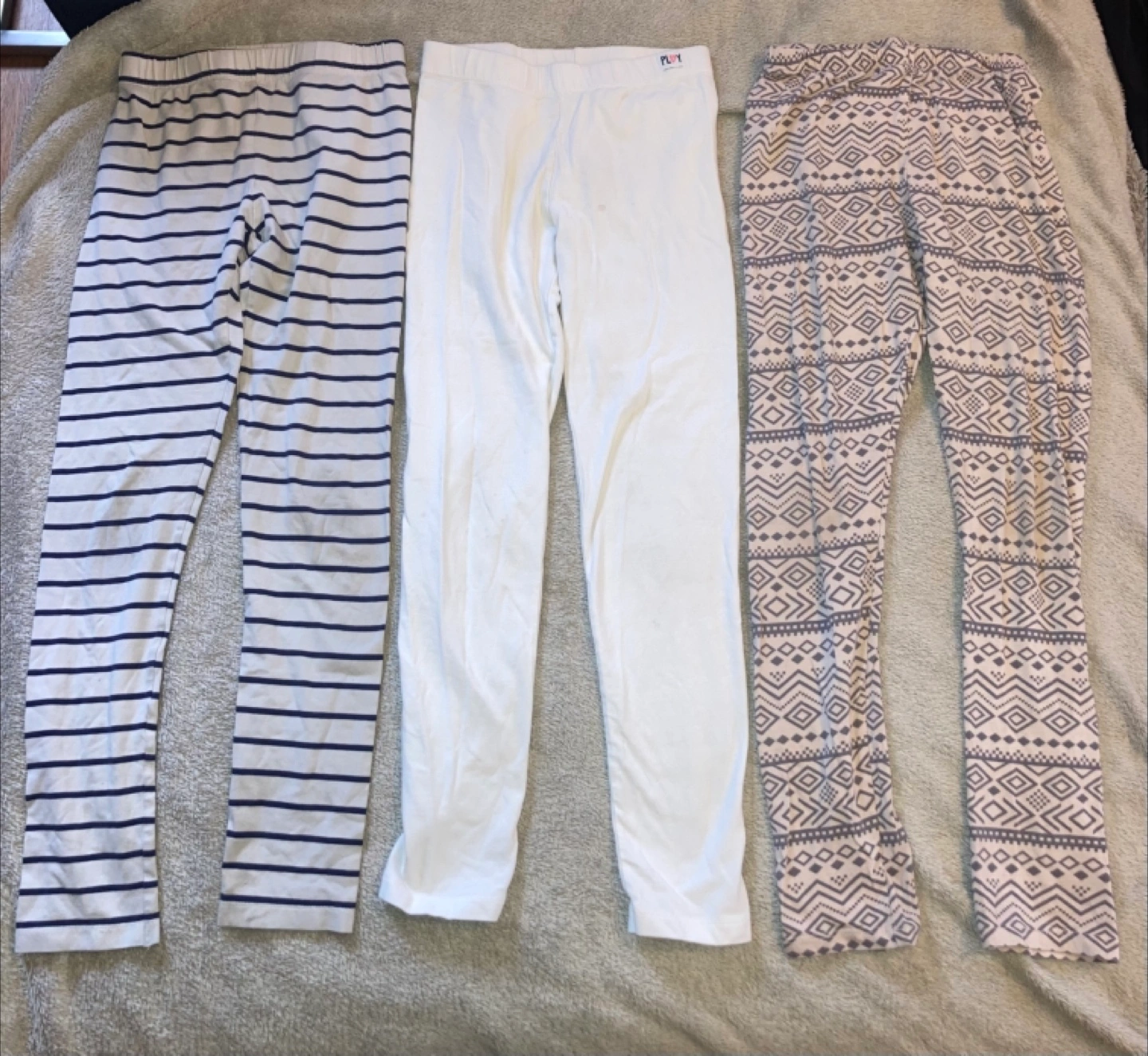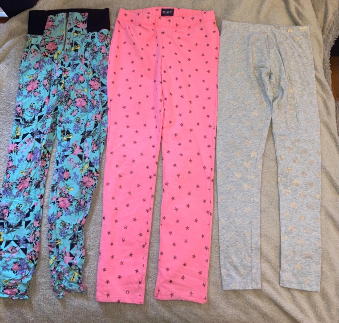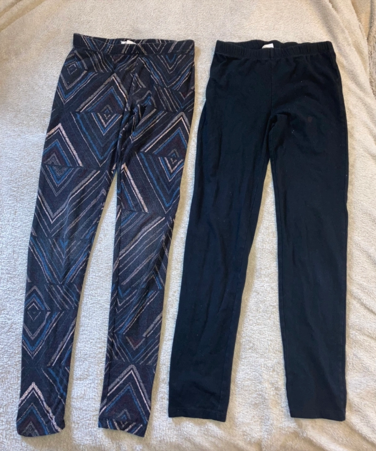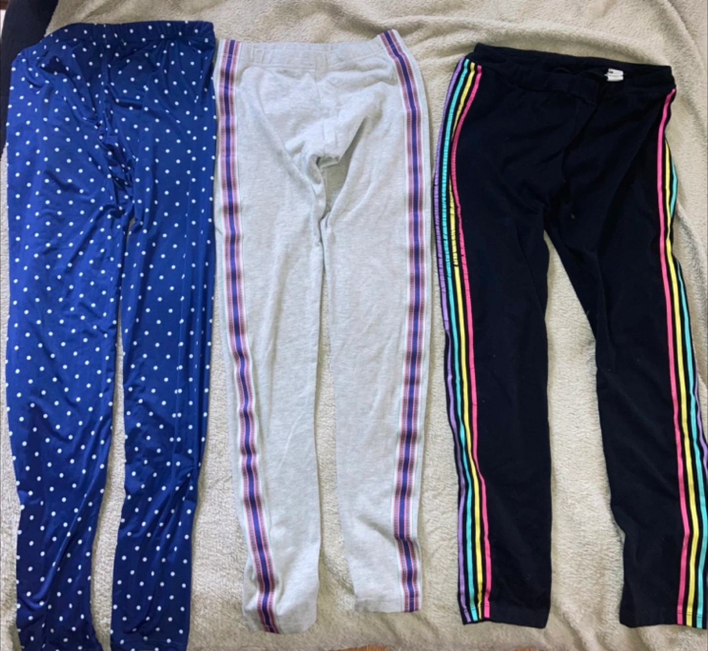Bundle of 11 girls' leggings. Various colours, patterns and brands. Good condition with minor stains on a couple of them. Perfect for school or play.