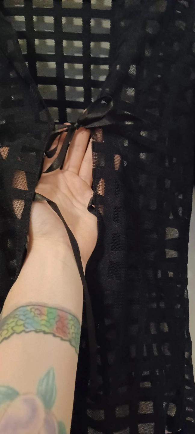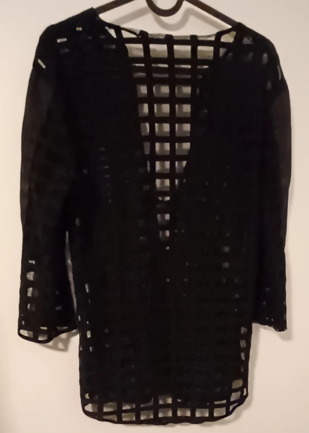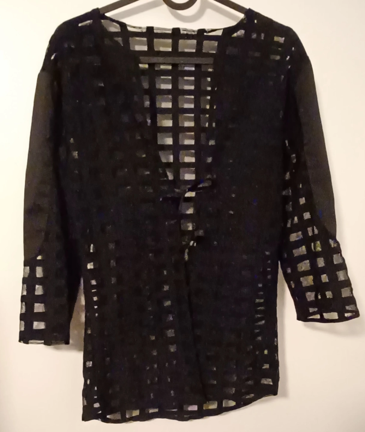 Lightweight black sheer cardigan. Features a grid pattern and three-quarter sleeves. Open front with a tie detail. Semi-sheer fabric. Rad-cycled from a men's button up with added tie front! 💫♻️✨️